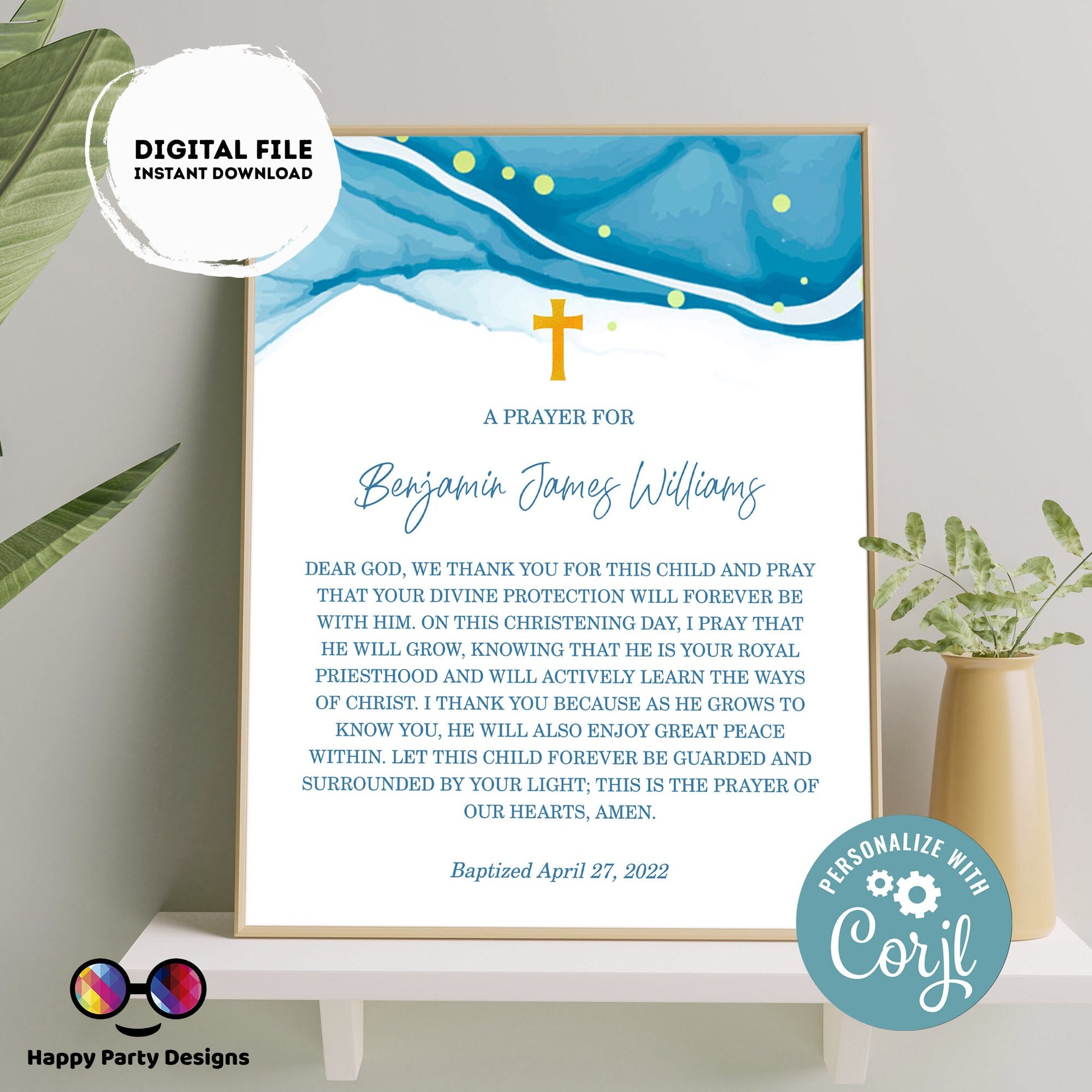 Baptism Prayer Sign Template | Blue Watercolor | Personalized Prayer Sign | Baptism Boy | Editable Baptism Gift | Boy Baptism Sign