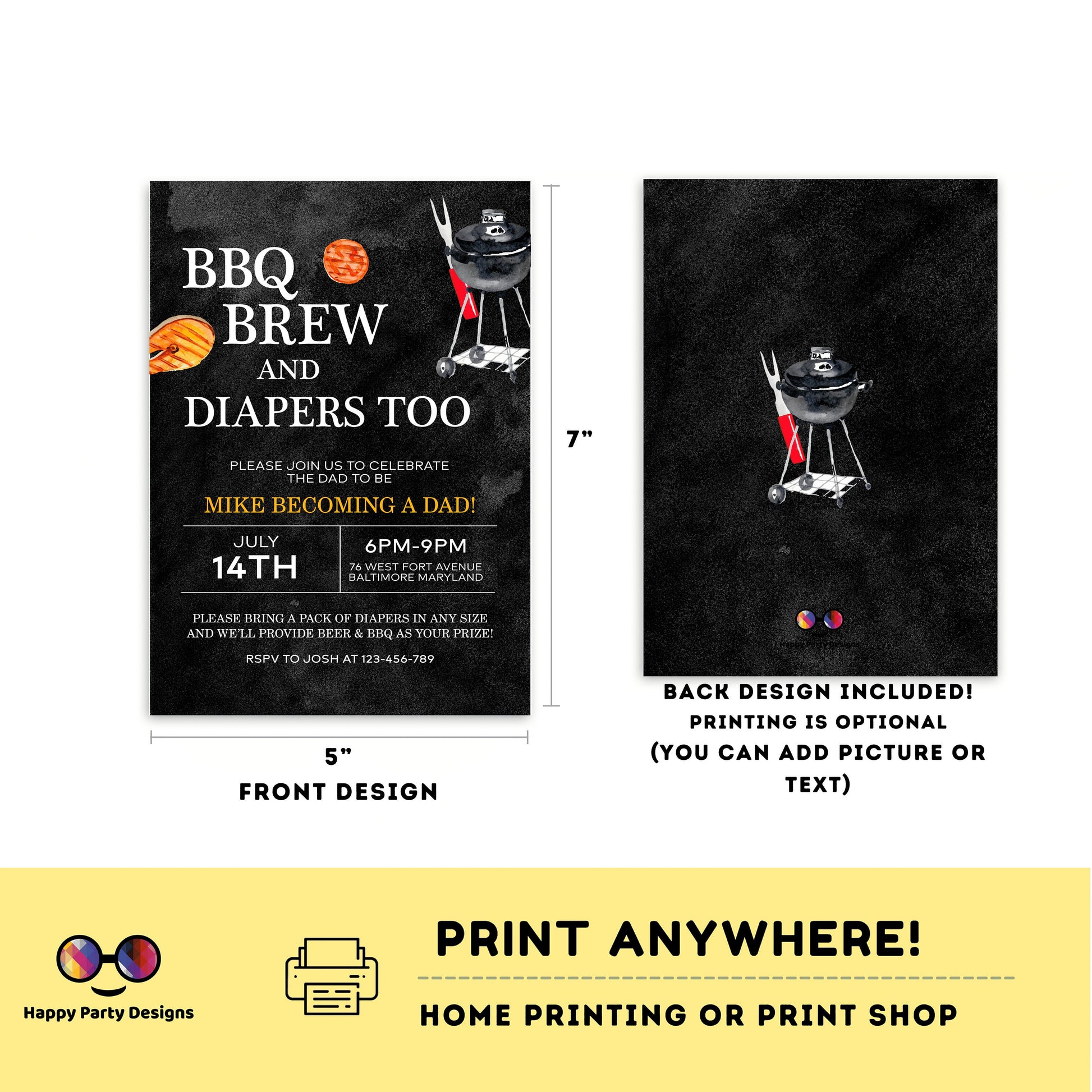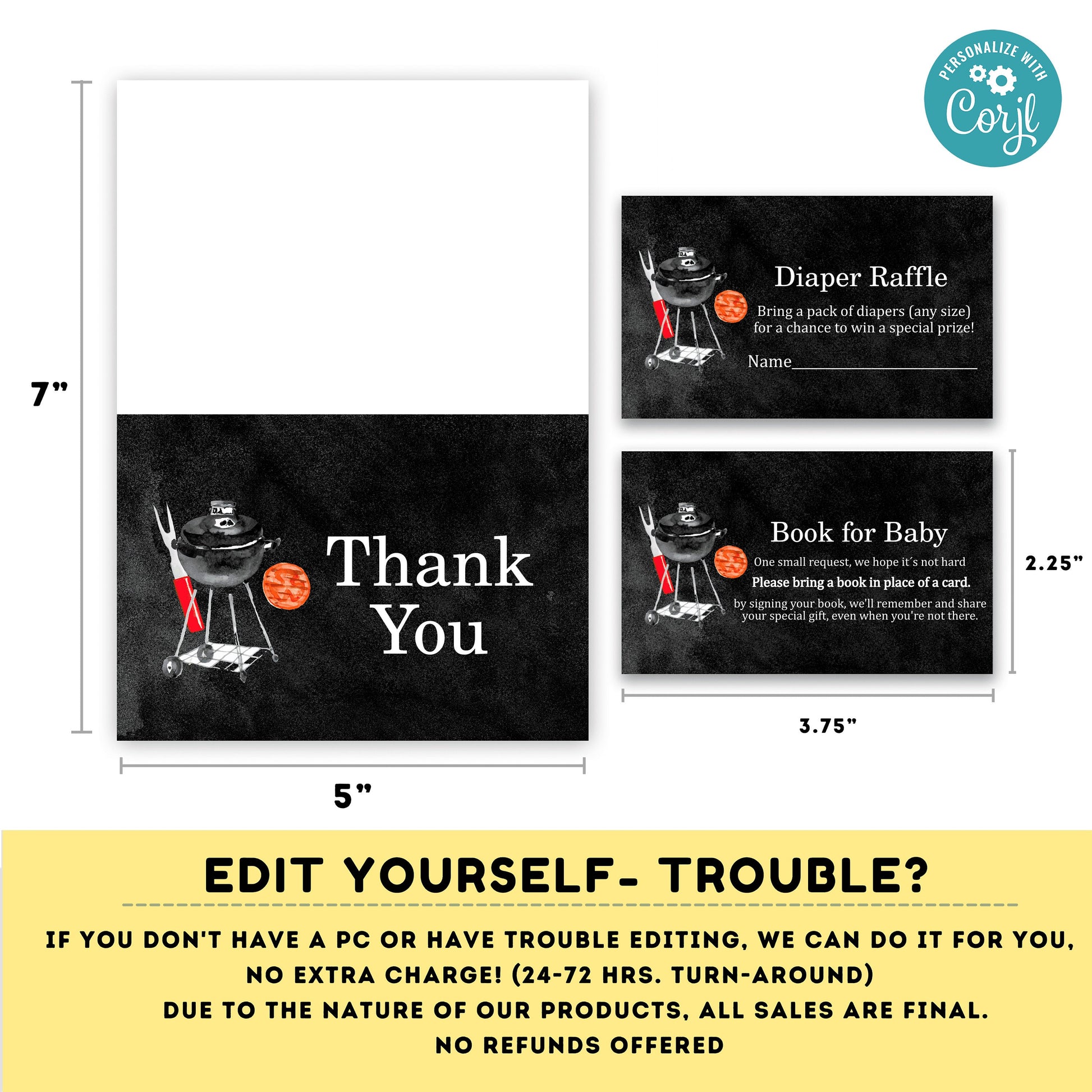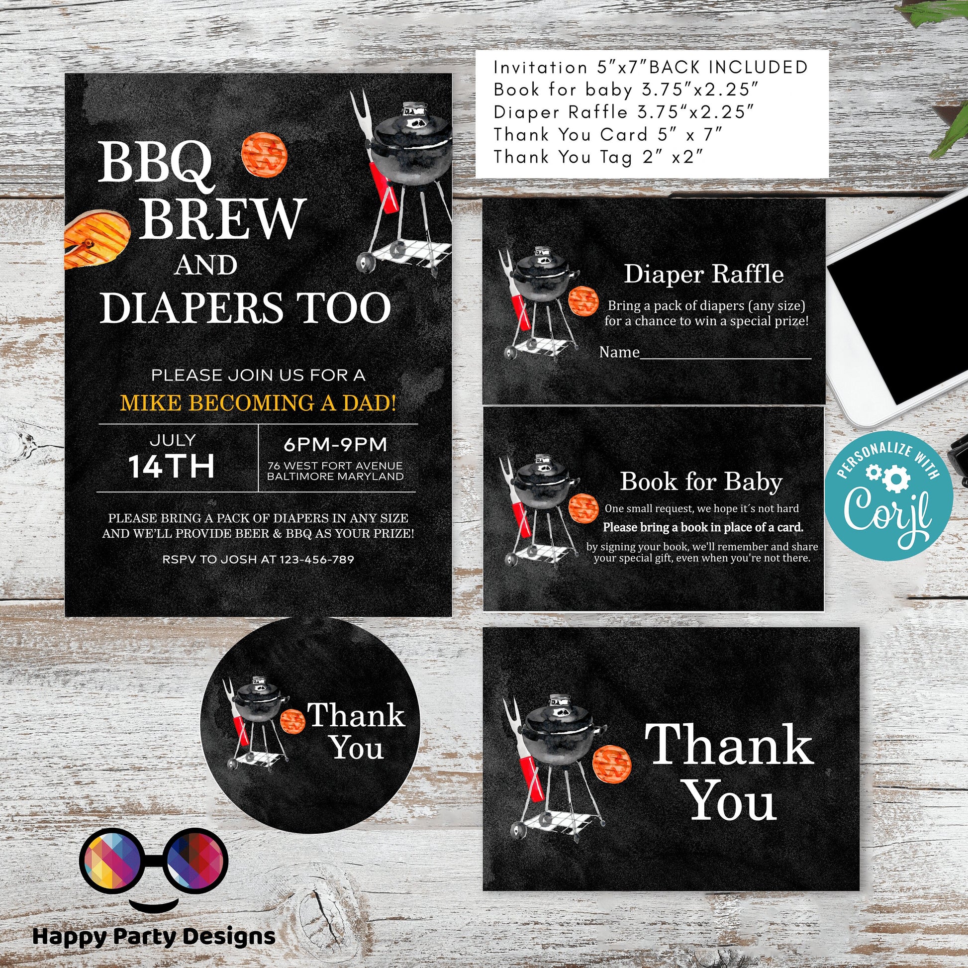 BBQ brew and diapers too Baby shower invitation bundle | diaper raffle, books for baby, thank you tag, thank you card | summer shower #B26