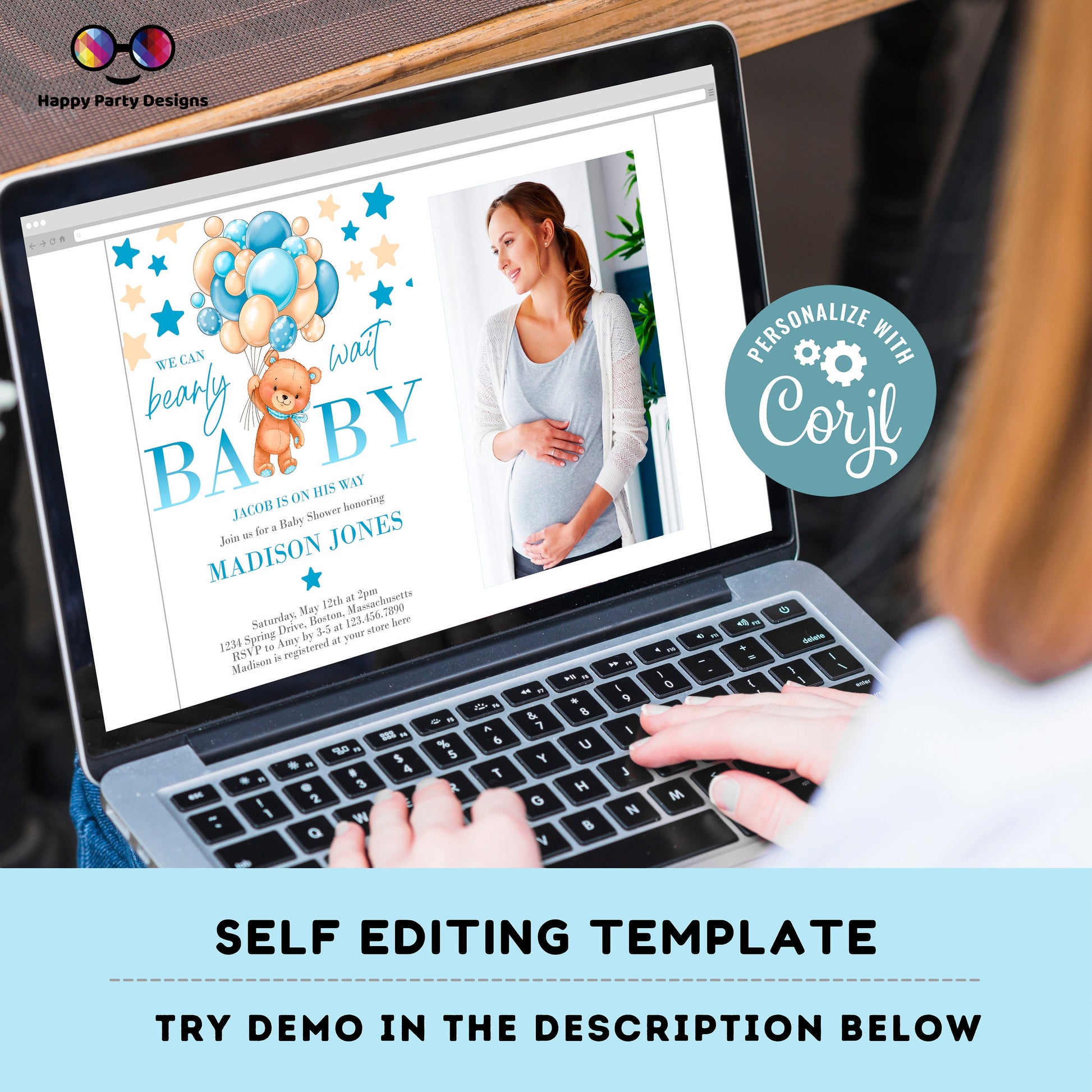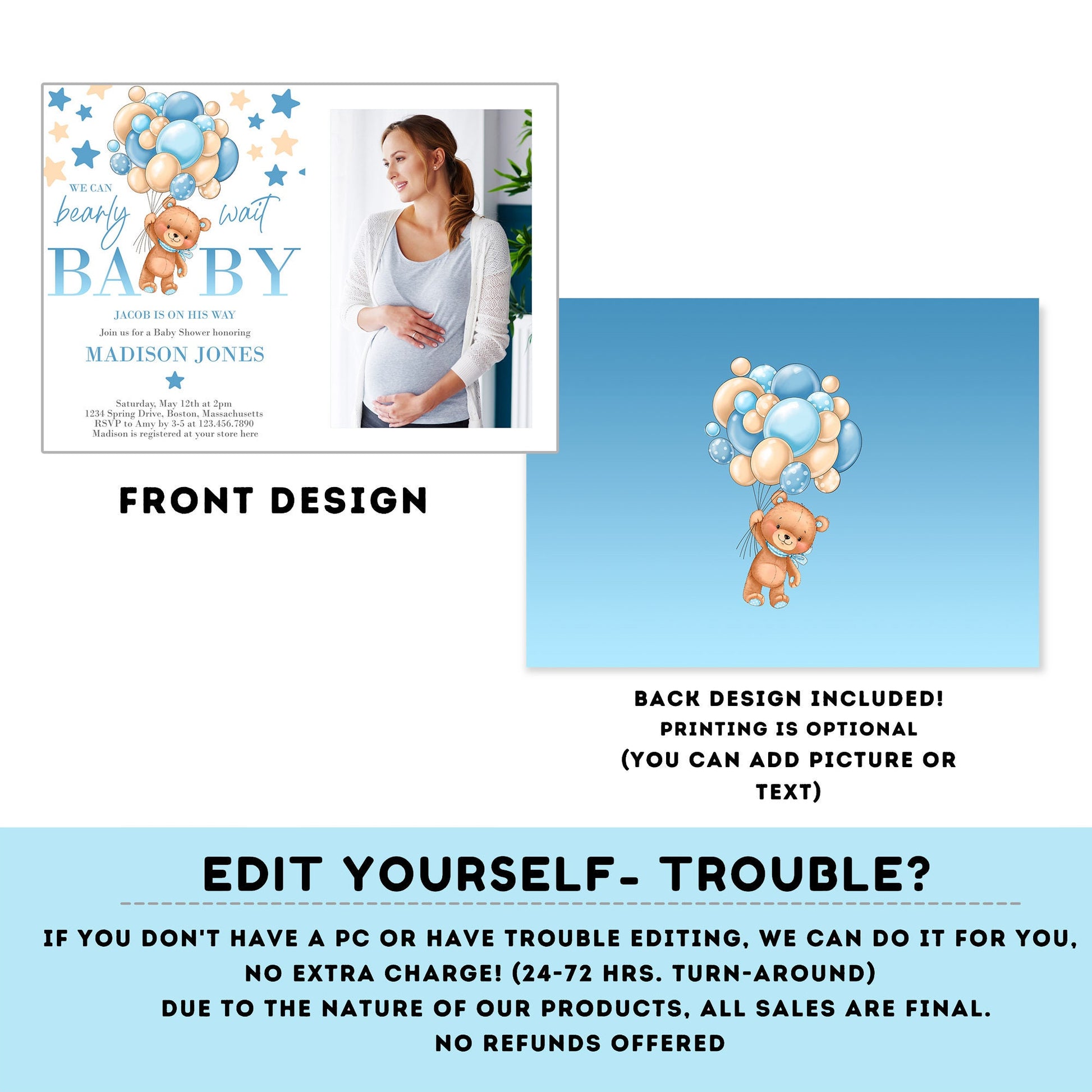 Bearly Wait Baby Shower Invitation with picture | blue Teddy bear baby shower invitation | teddy bear balloons Invitation template | #B22