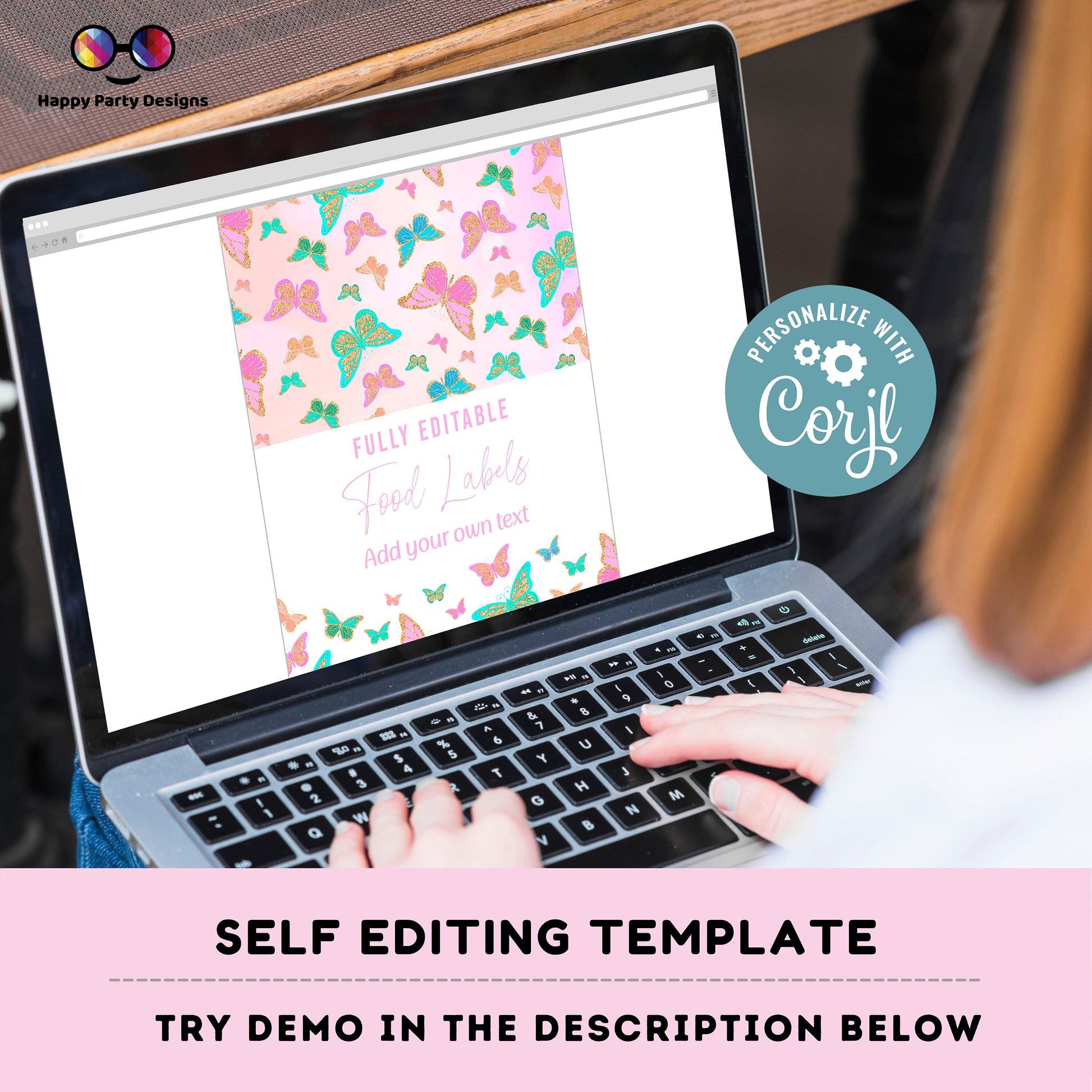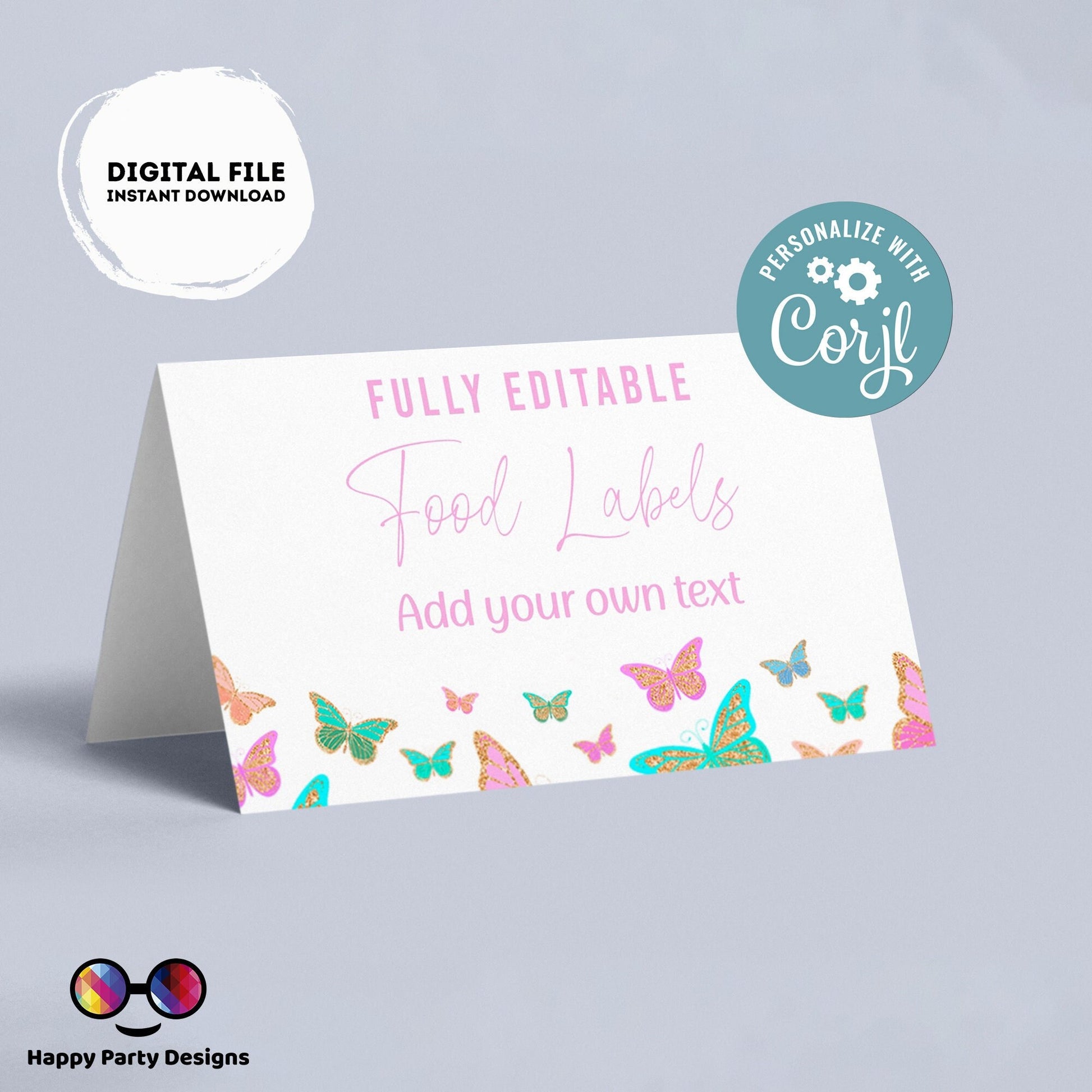 Pink Butterfly Food Tent Card Editable Template Girl Baby Shower Birthday Party Buffet Food Name Label DIY Printable, Blush Gold Decor.