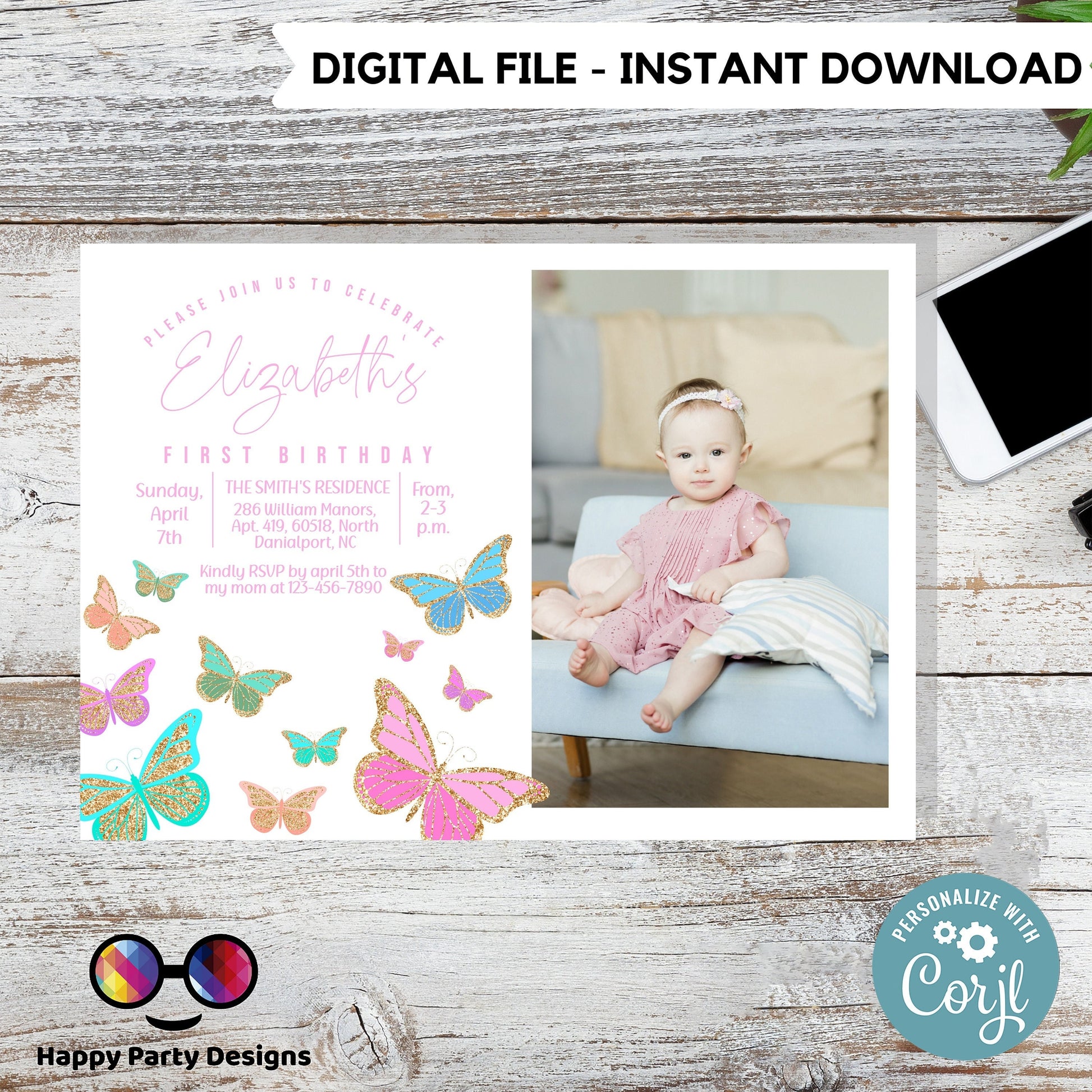Butterfly Birthday Invitation with photo | Butterflies | Pastel Butterflies | Girl Birthday | Pink Purple Butterfly | Butterfly #0002