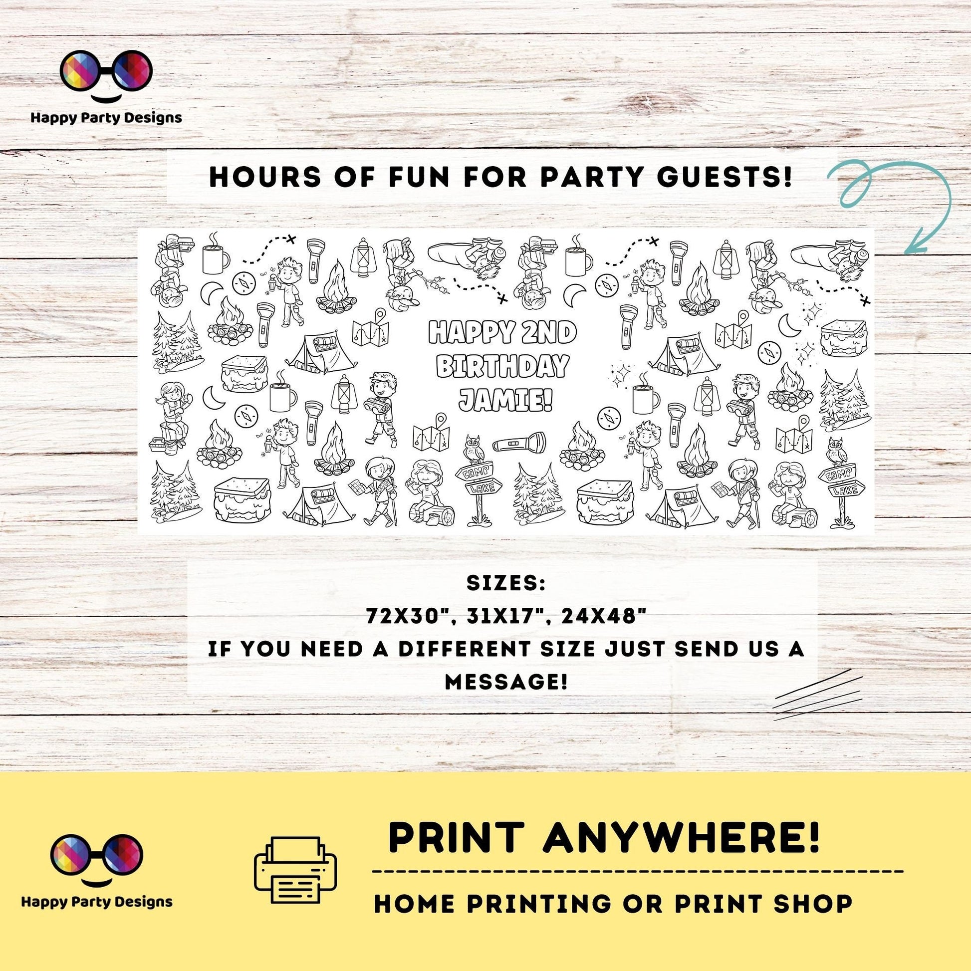 Camping XL Coloring table runner | Editable Camping Birthday coloring page | Camping birthday Happy Camper Party Activity | bag filler #K95