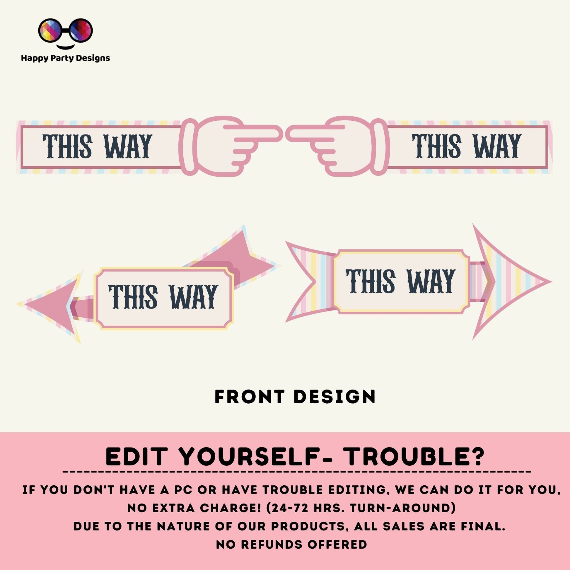 Carnival Party Directional Signs - Direction Arrows - Pink Yellow - Circus Party - INSTANT DOWNLOAD with EDITABLE text.