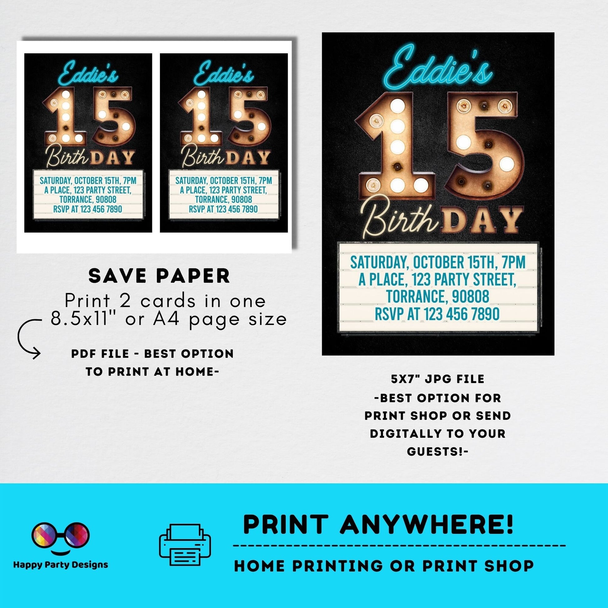 Editable 15th birthday invitation template | editable 15th birthday bulb lights birthday invite | marquee birthday party invites #K208