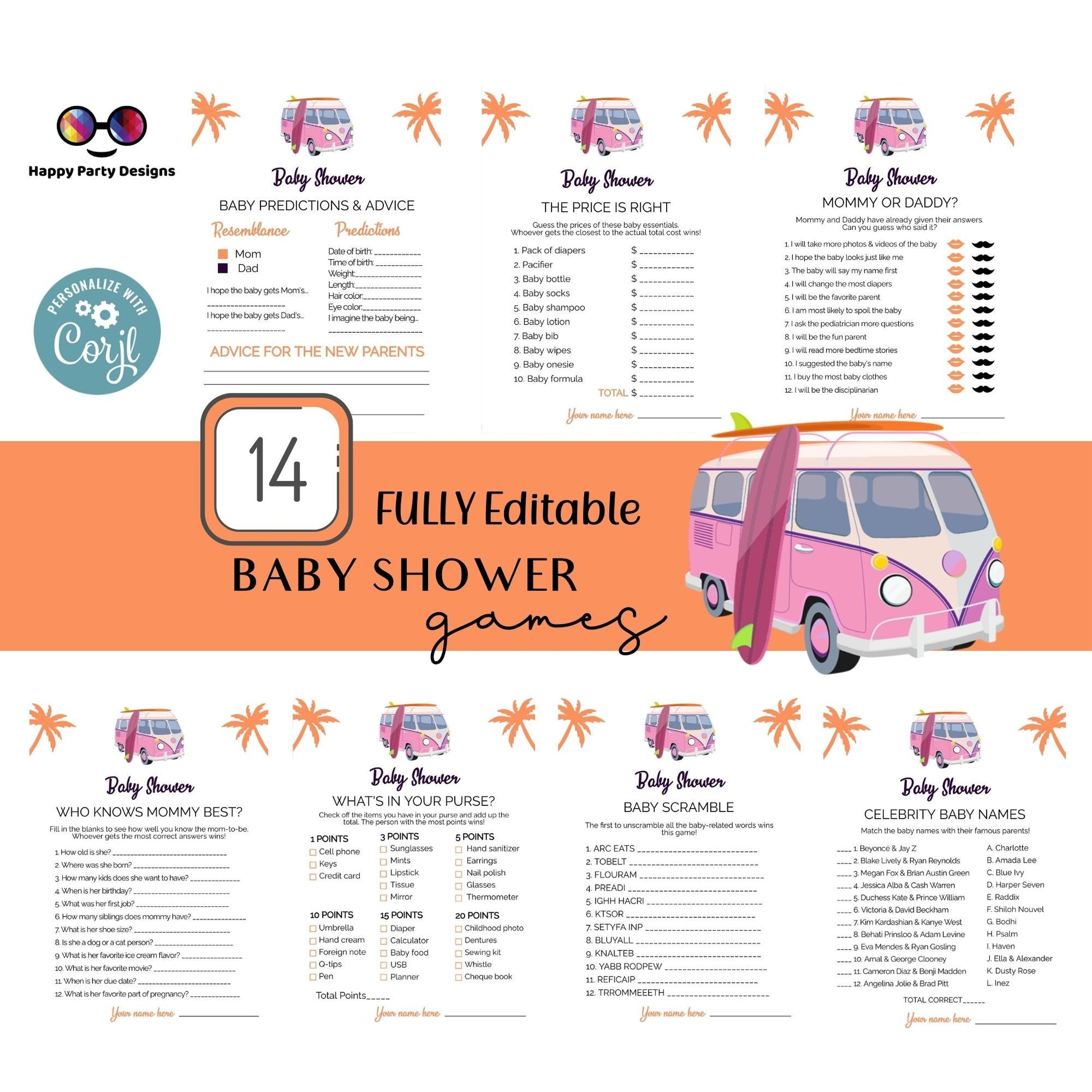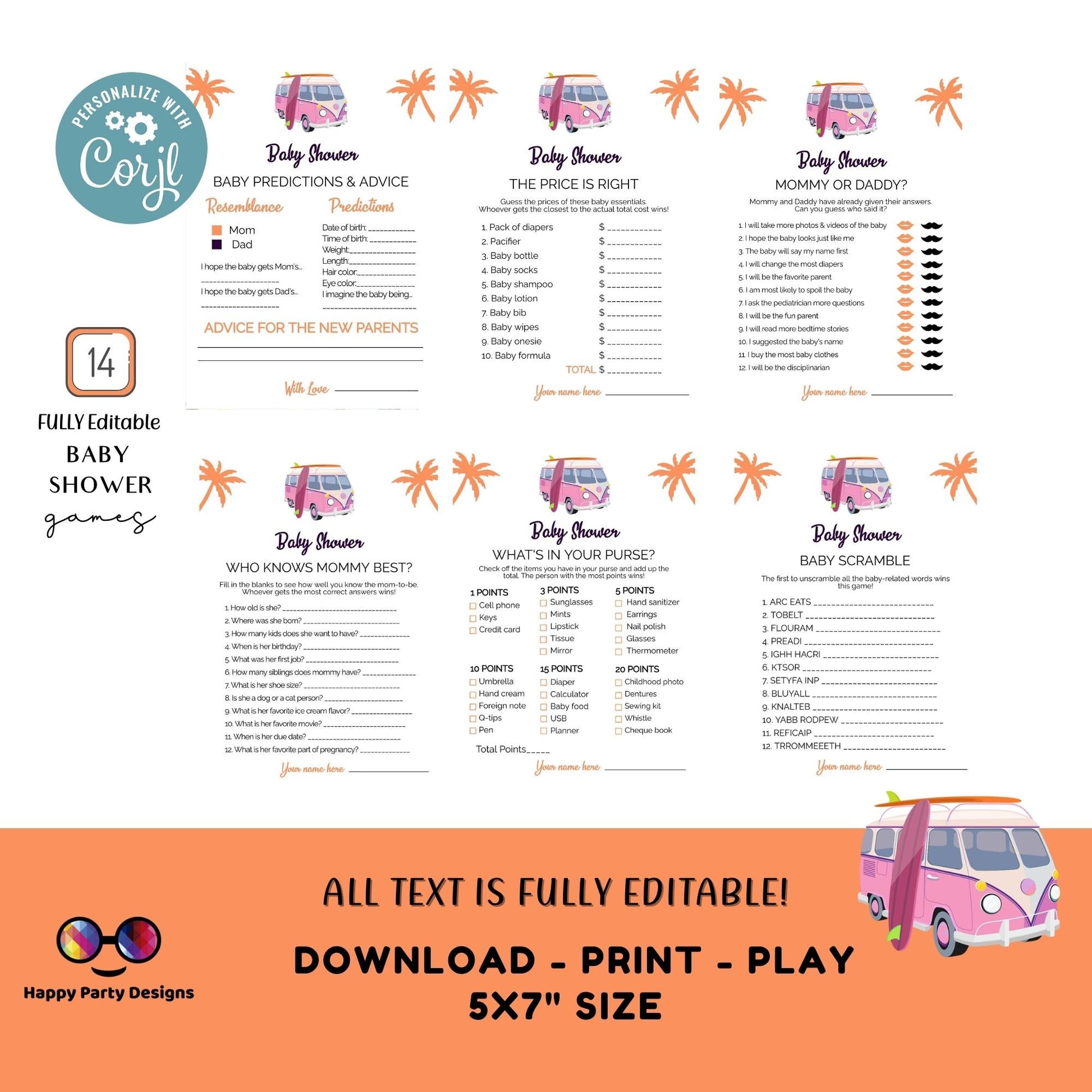 Editable tropical shower games bundle. Baby girl . Editable template with Corjl.com