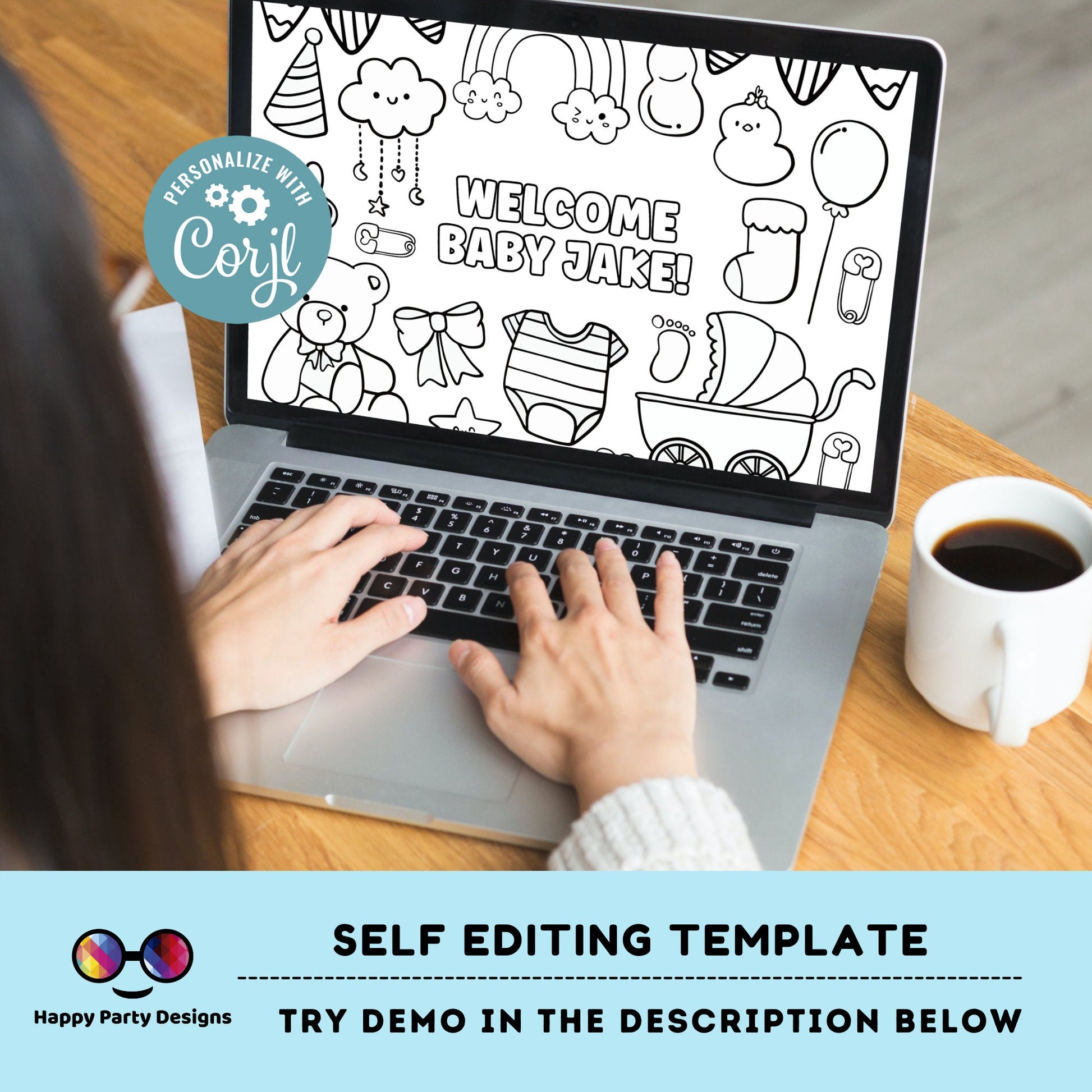 Editable baby shower coloring page | Placemat coloring page | Any Age | Baby shower | Baby shower activity | party placemat | Baby boy