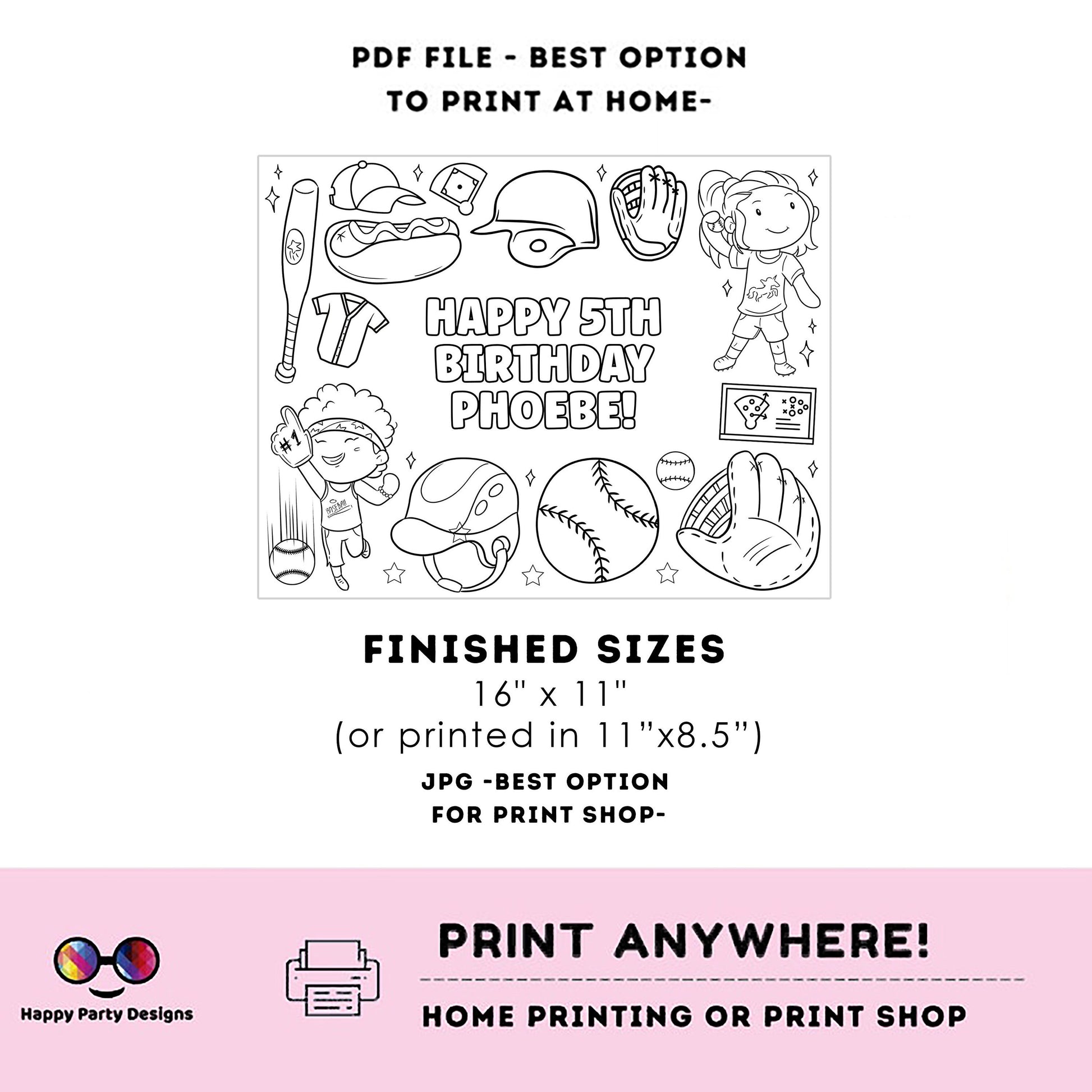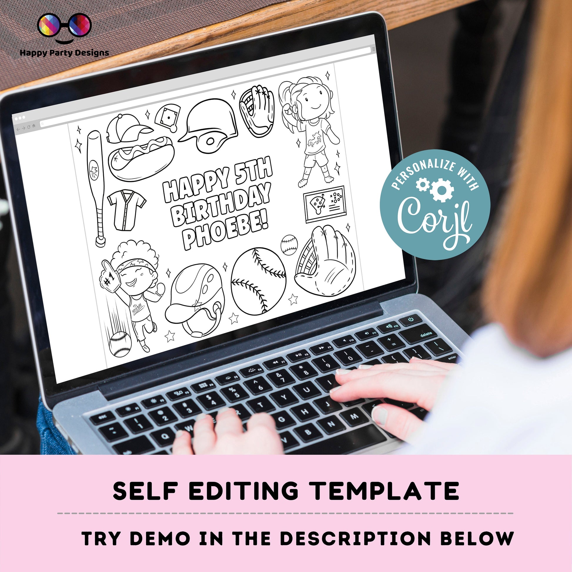 Editable Baseball Birthday coloring Page | Sports Party | Baseball coloring page | kids playing Baseball coloring placemat Edit Online #K157