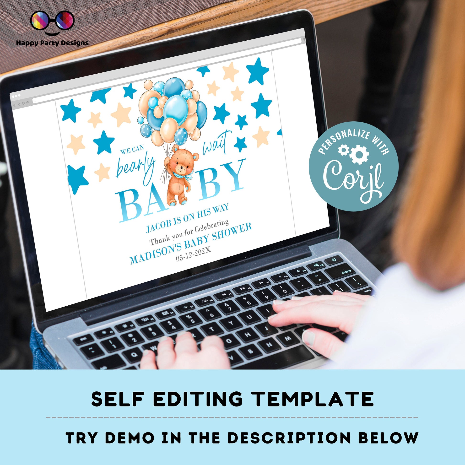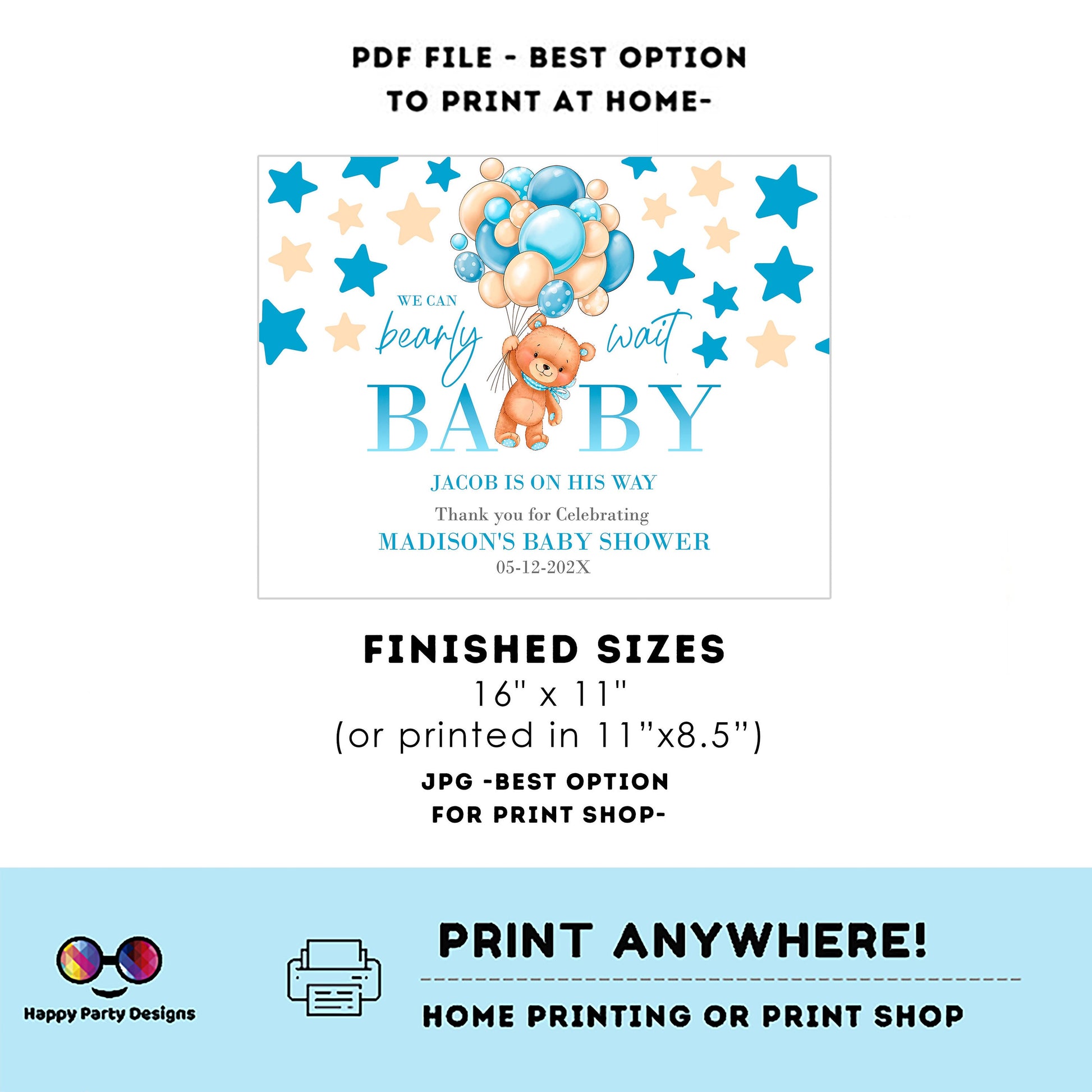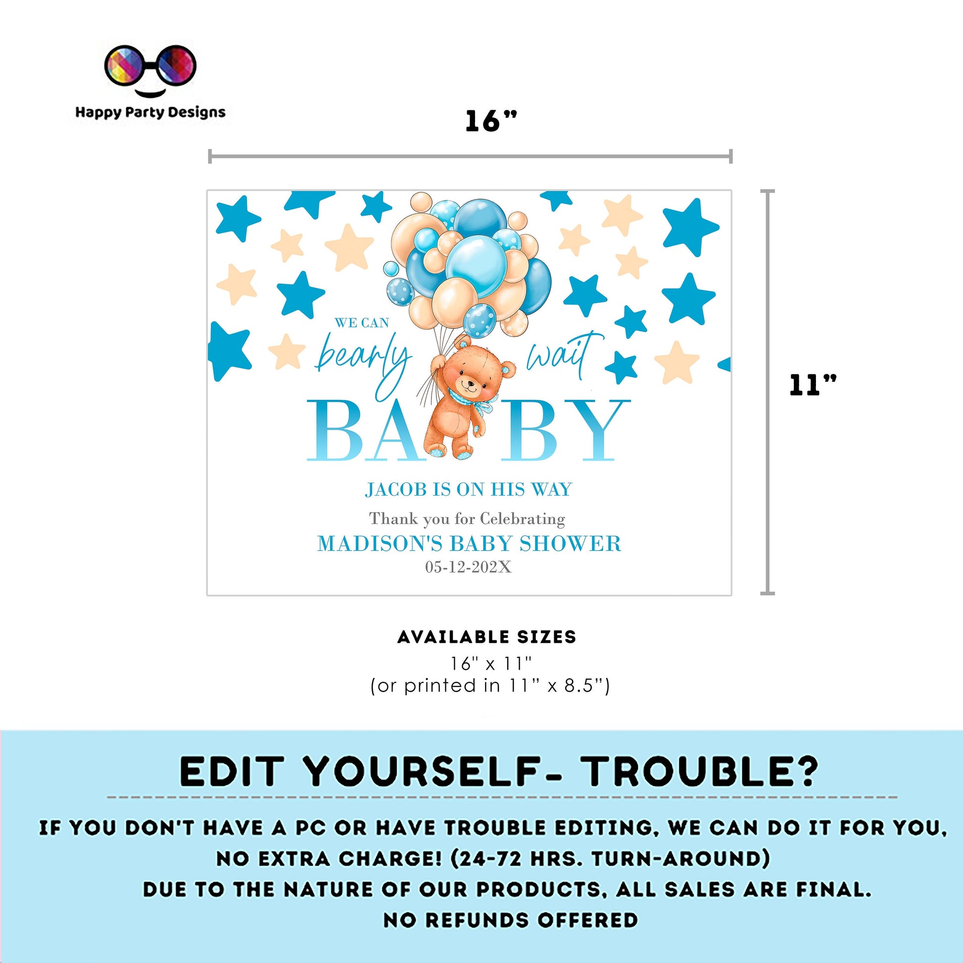 Editable bear and balloons baby shower Placemat | Teddy bear baby shower | Baby boy | baby shower decor | boy baby shower #B22