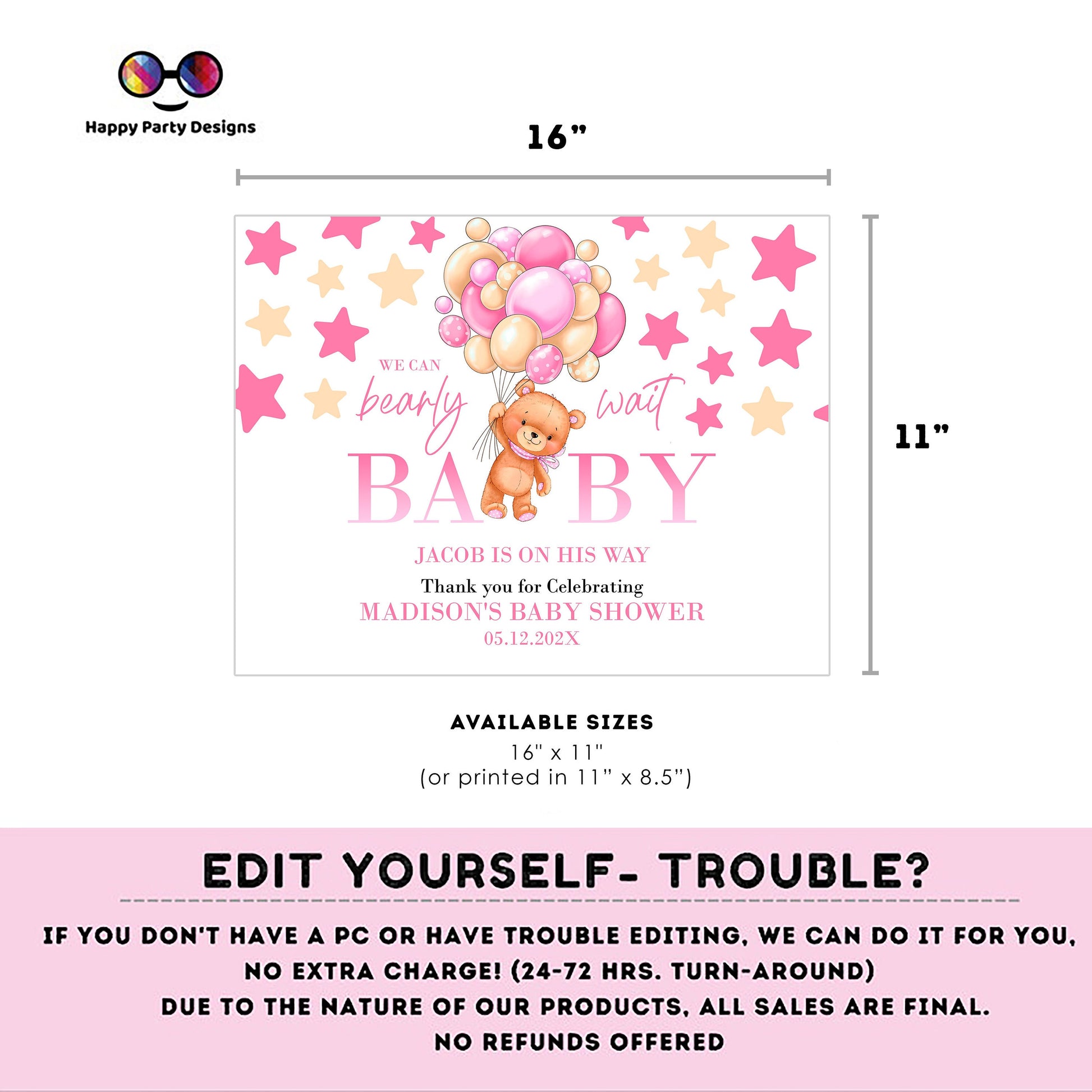 Editable bear and balloons baby shower Placemat | Teddy bear baby shower | Baby girl | baby shower decor | girl baby shower #B21