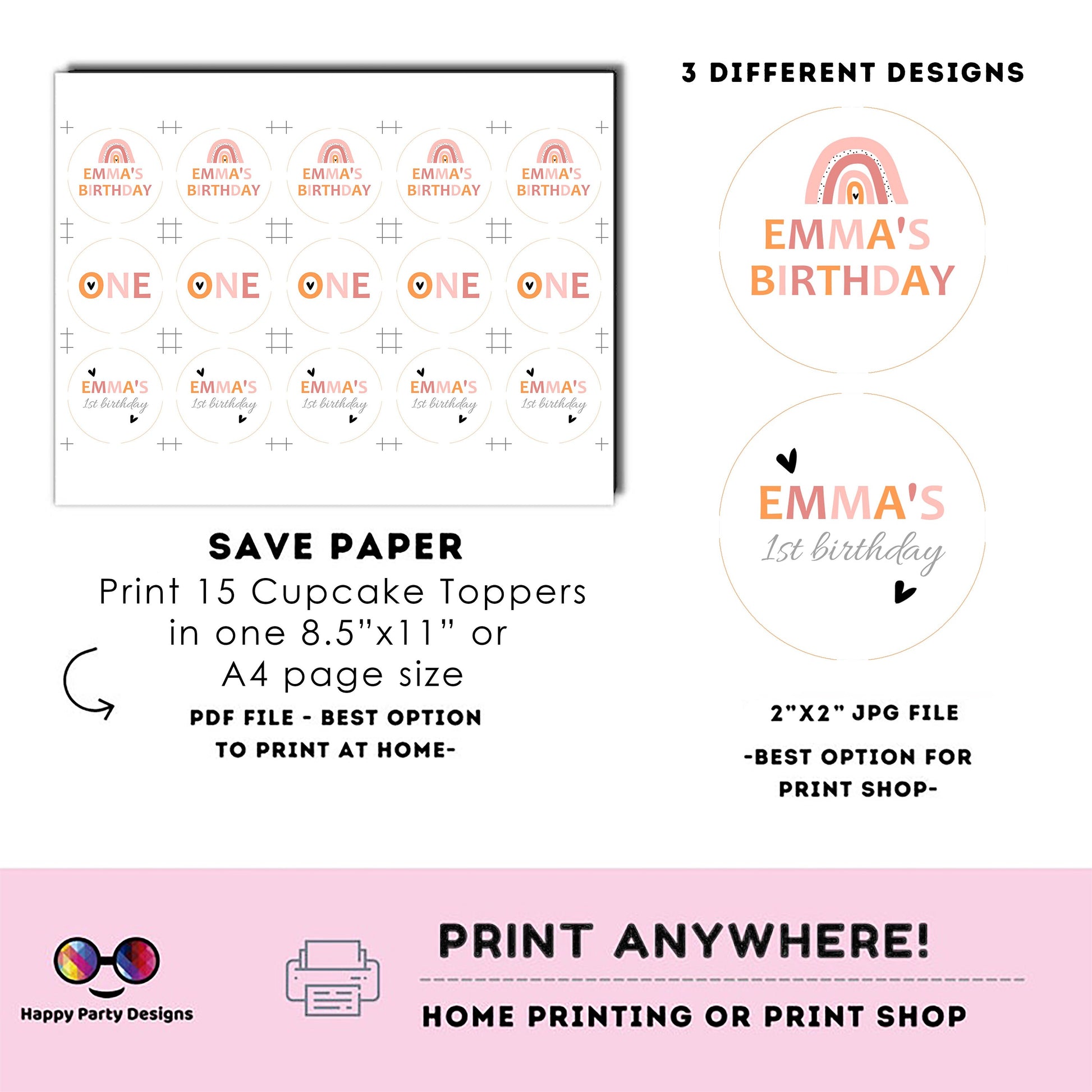 - 3 different designs, 2" Editable digital cupcake toppers/can be used as stickers too! (JPG & PDF Files)