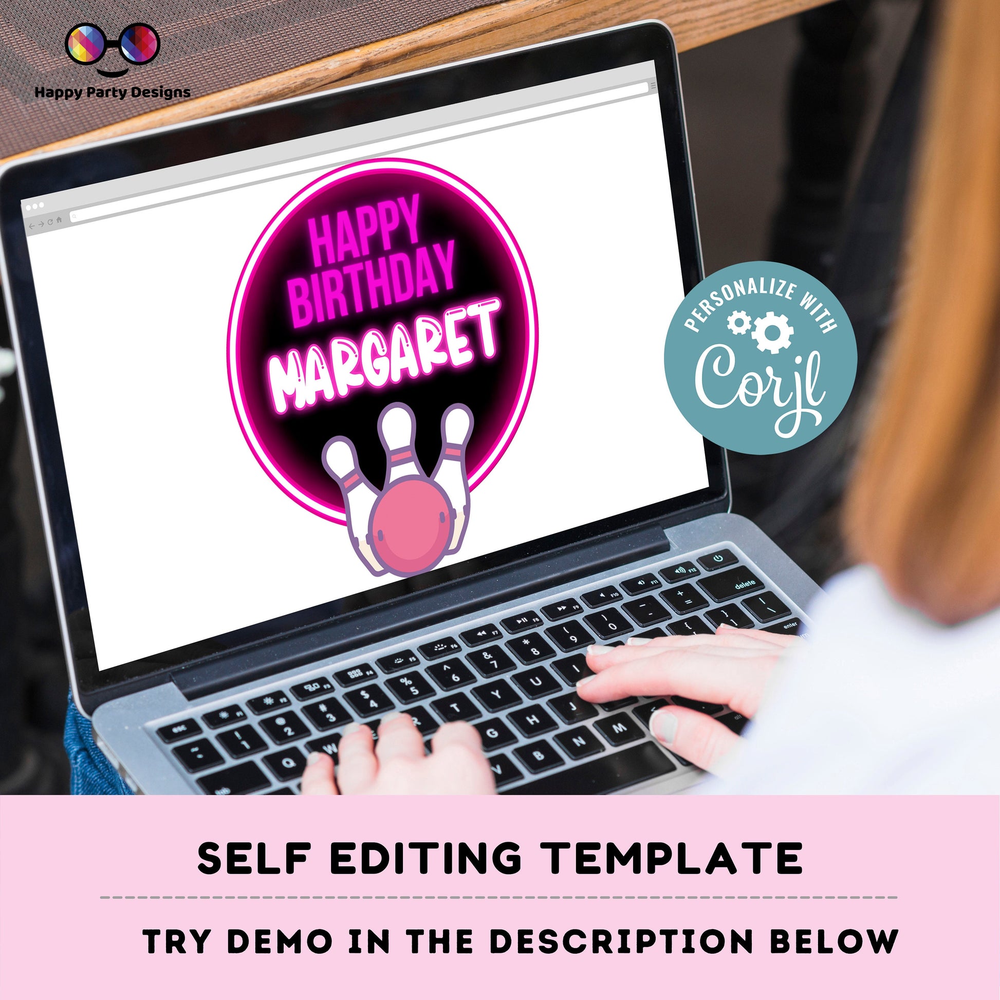 Editable neon bowling Thank you tag. Birthday Girl . Editable template with Corjl.com