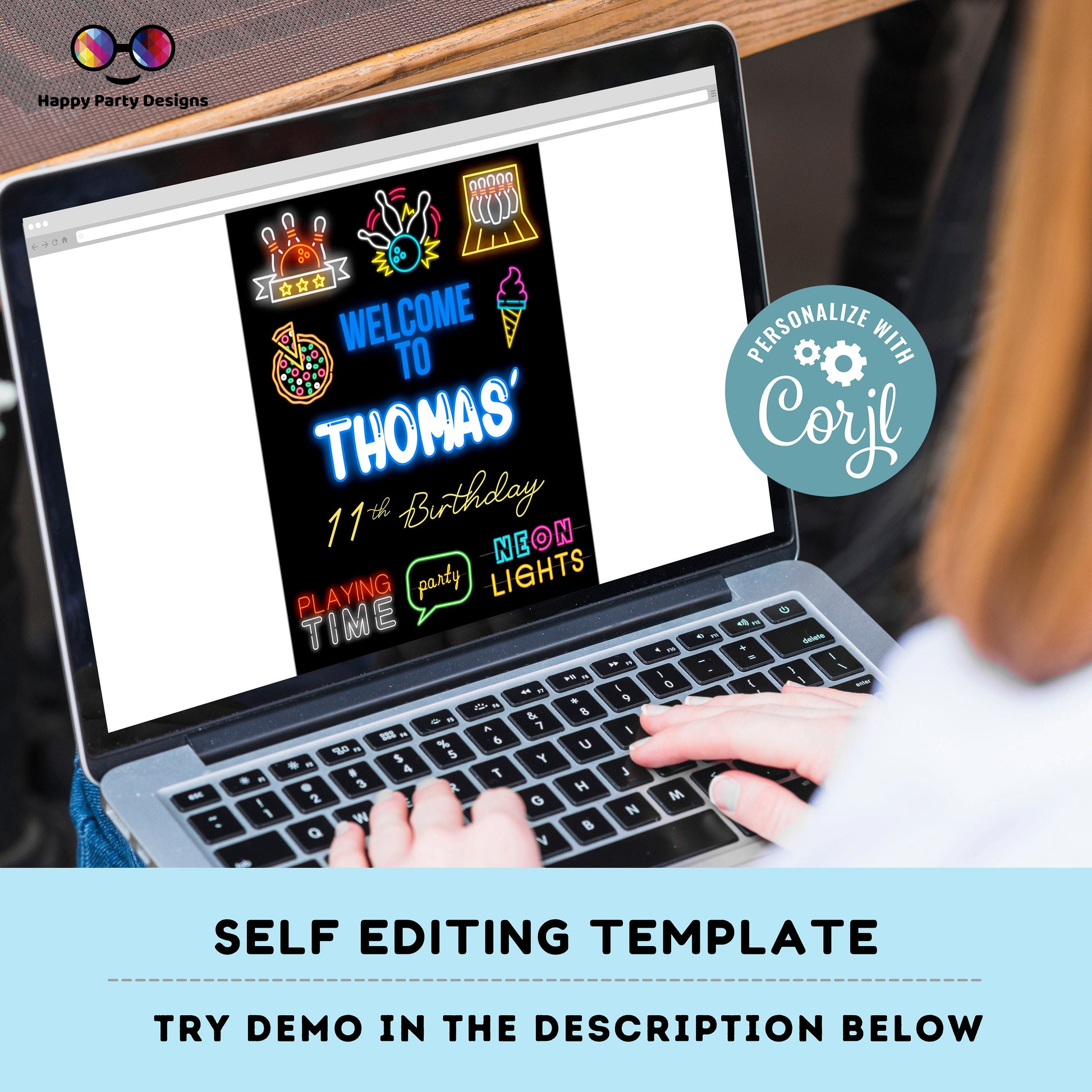 Bowling party Welcome Template, neon blue Bowling Welcome Sign, Girl Welcome Poster, Boy Welcome Poster, Editable Template, neon Welcome Sign