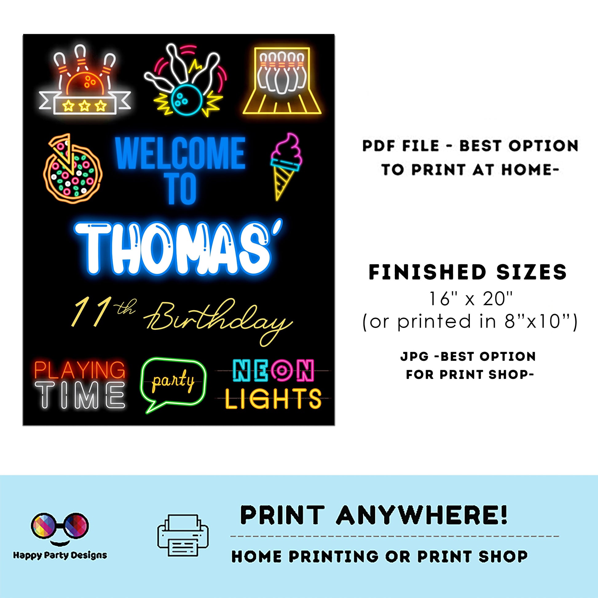 Editable Bowling Welcome Sign Template, Bowling Birthday Party Sign, neon Sign, neon Bowling Birthday Sign, Download, Editable, neon.