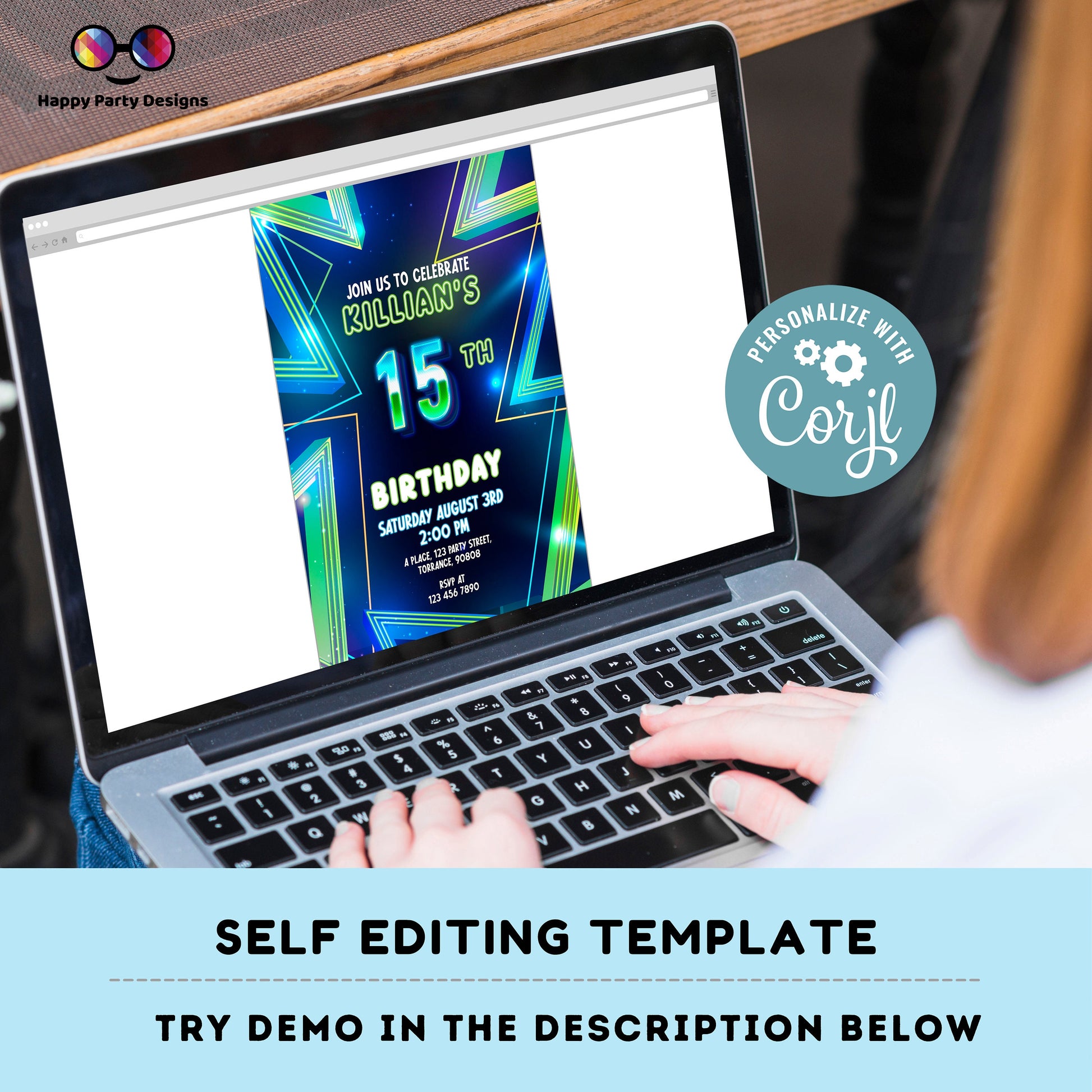 EDITABLE Boy 15th birthday invitation | Neon Glow in the dark Party | Birthday Boy | 15th Neon Green Blue Birthday | glow party #K185