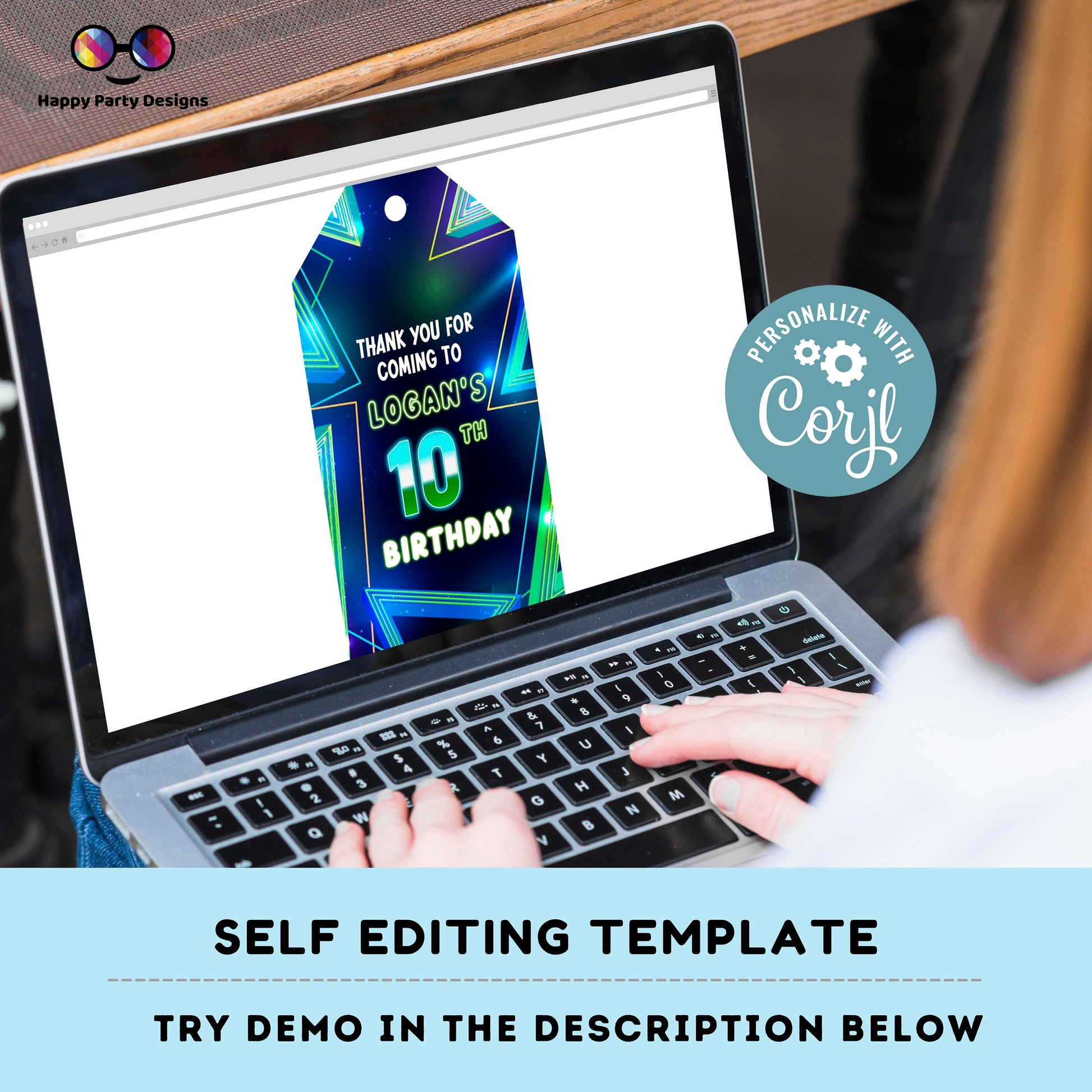 Neon Glow tag EDITABLE, Neon Glow favor tag , Neon Glow Birthday tag Party Invitation, Neon Glow Birthday Invitation tag, Boy Birthday Invitation, Digital Instant Download. Neon Glow Party favor tag,