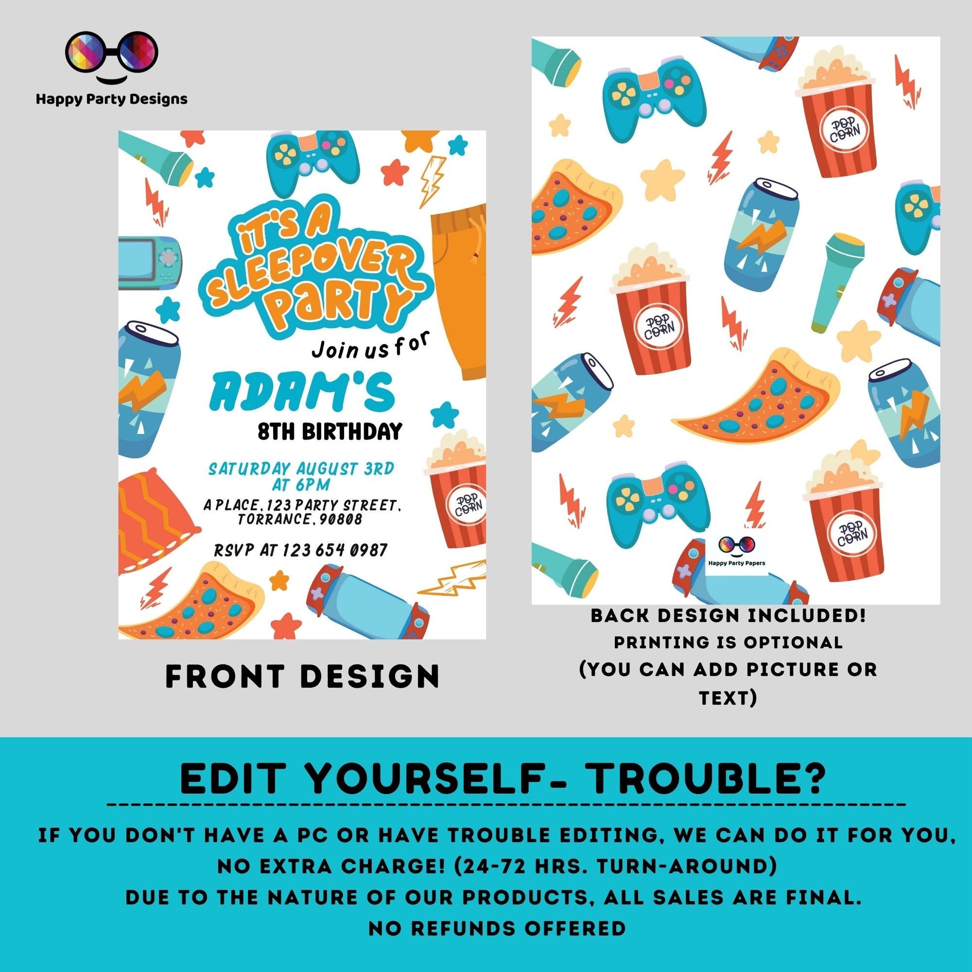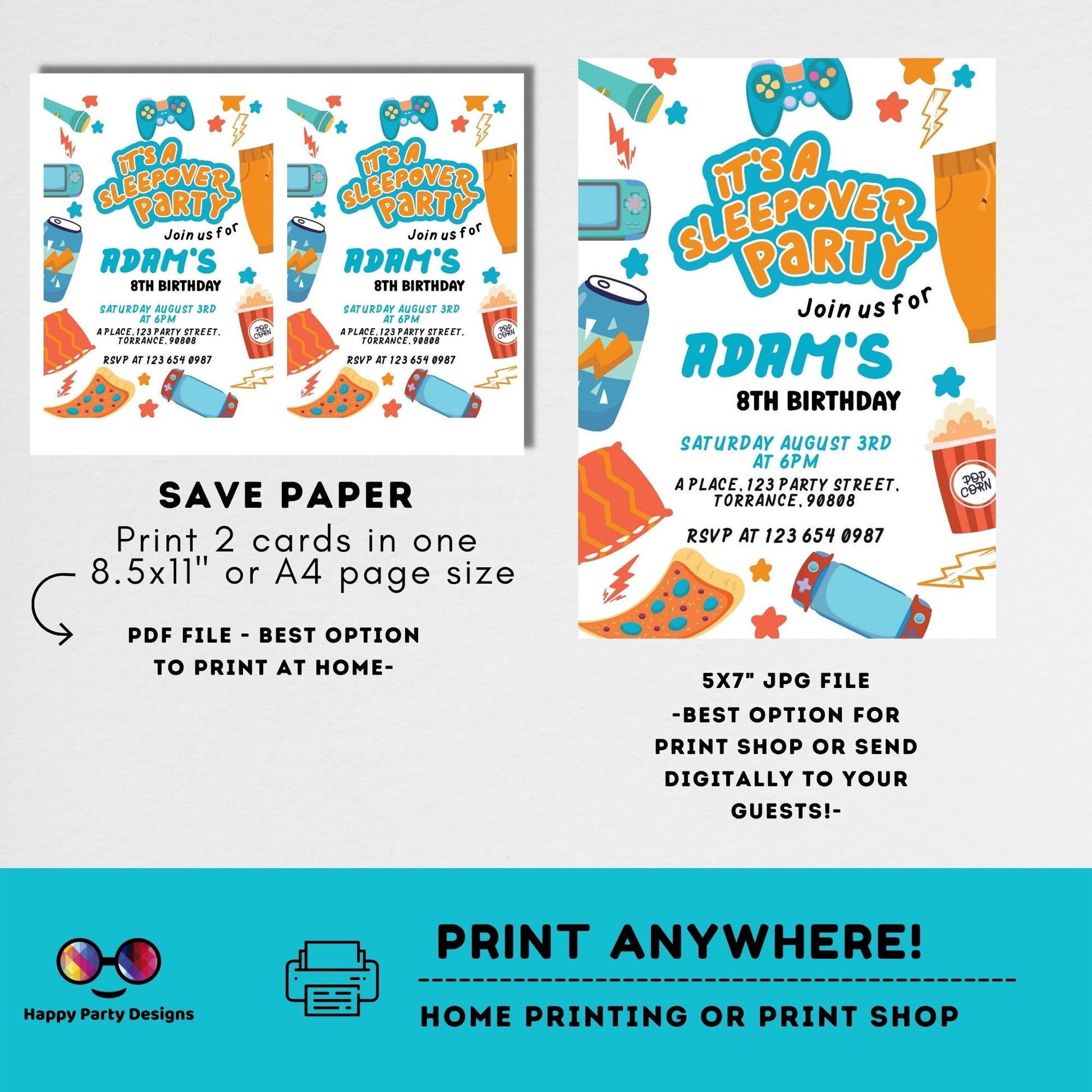 EDITABLE Boy sleepover party birthday invitation | Editable template | stars slumber party or sleep under birthday invite| Instant Download | Digital | Personalize Online | retro vibe Boy | pizza, games, gamer. any age. 8th birthday.