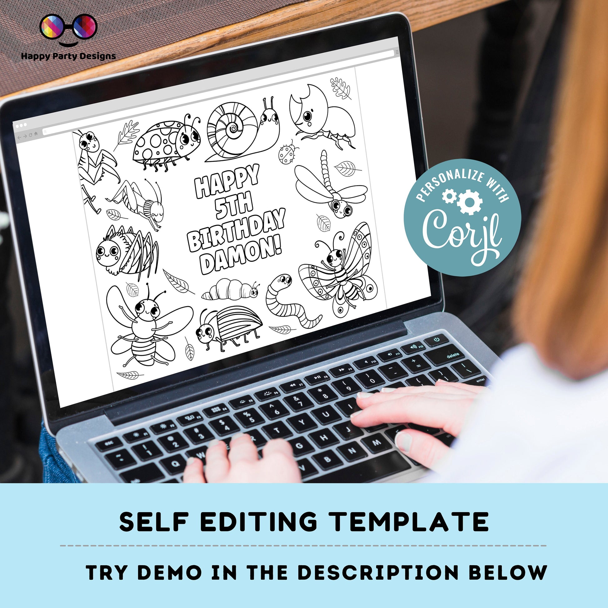 Editable Bugs coloring page | Placemat coloring page | Any Age | Bugs birthday party | Bugs and Insects Party Activity #K49