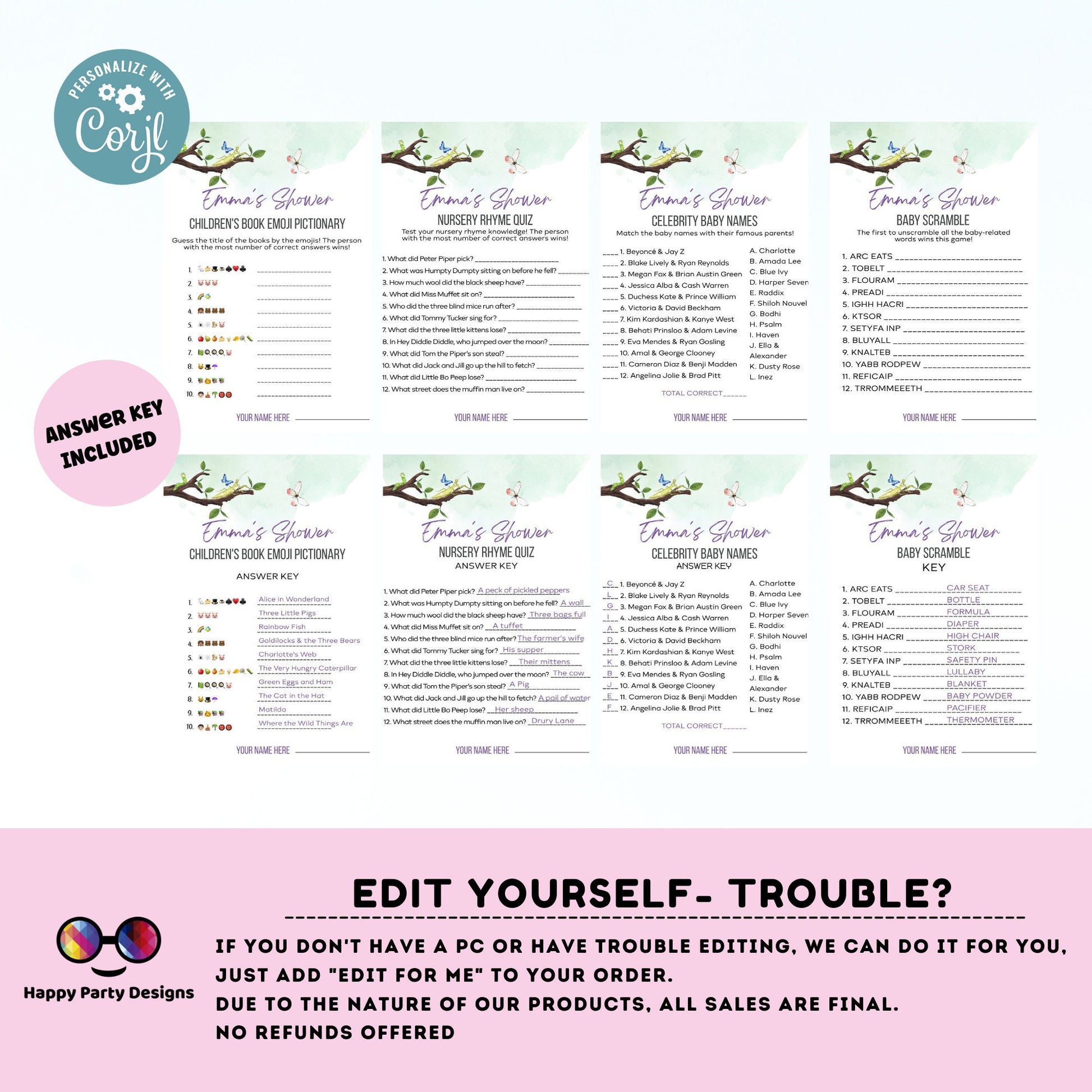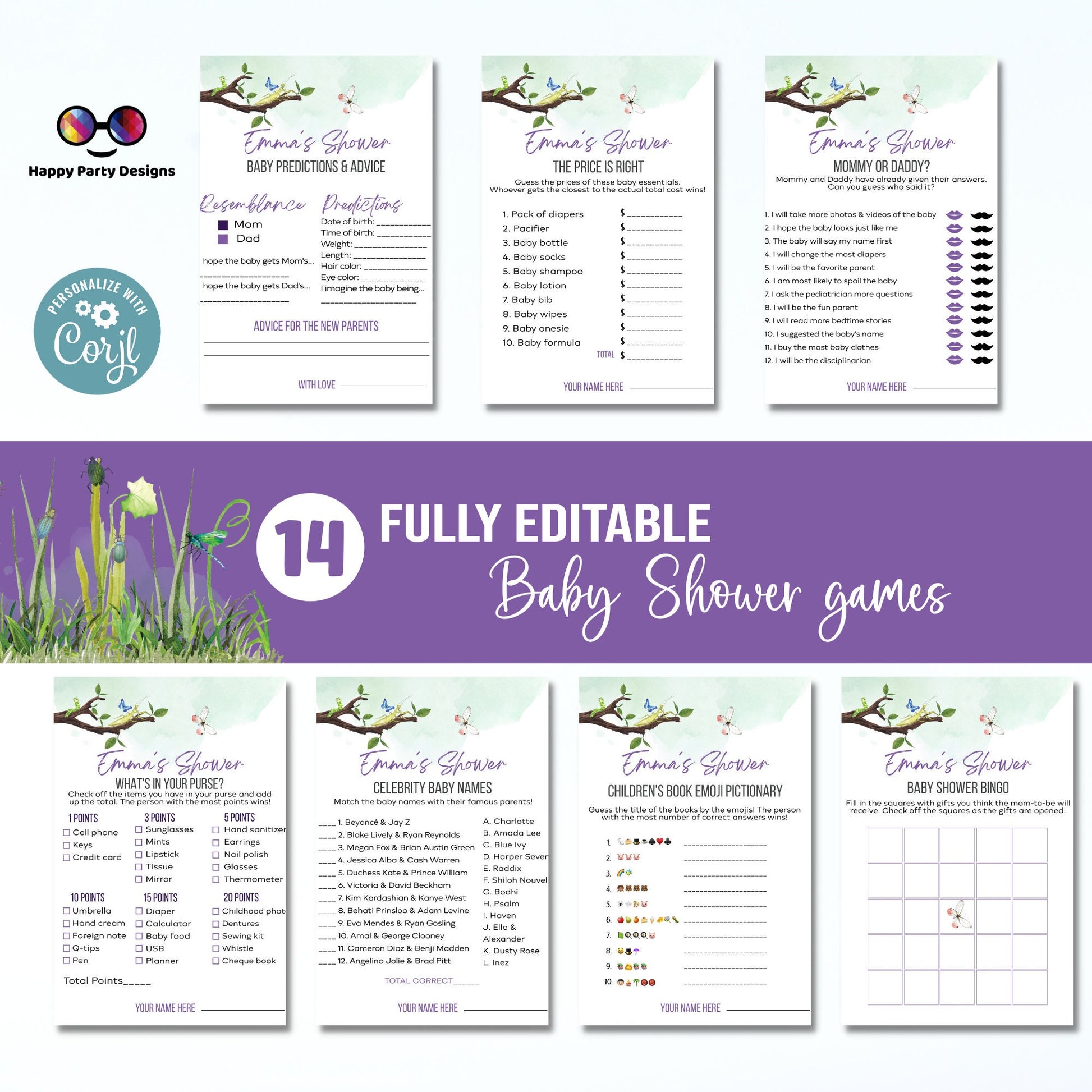 Editable bugs games bundle | bugs baby shower games | Baby girl | insect shower | green baby shower games | butterfly #B27