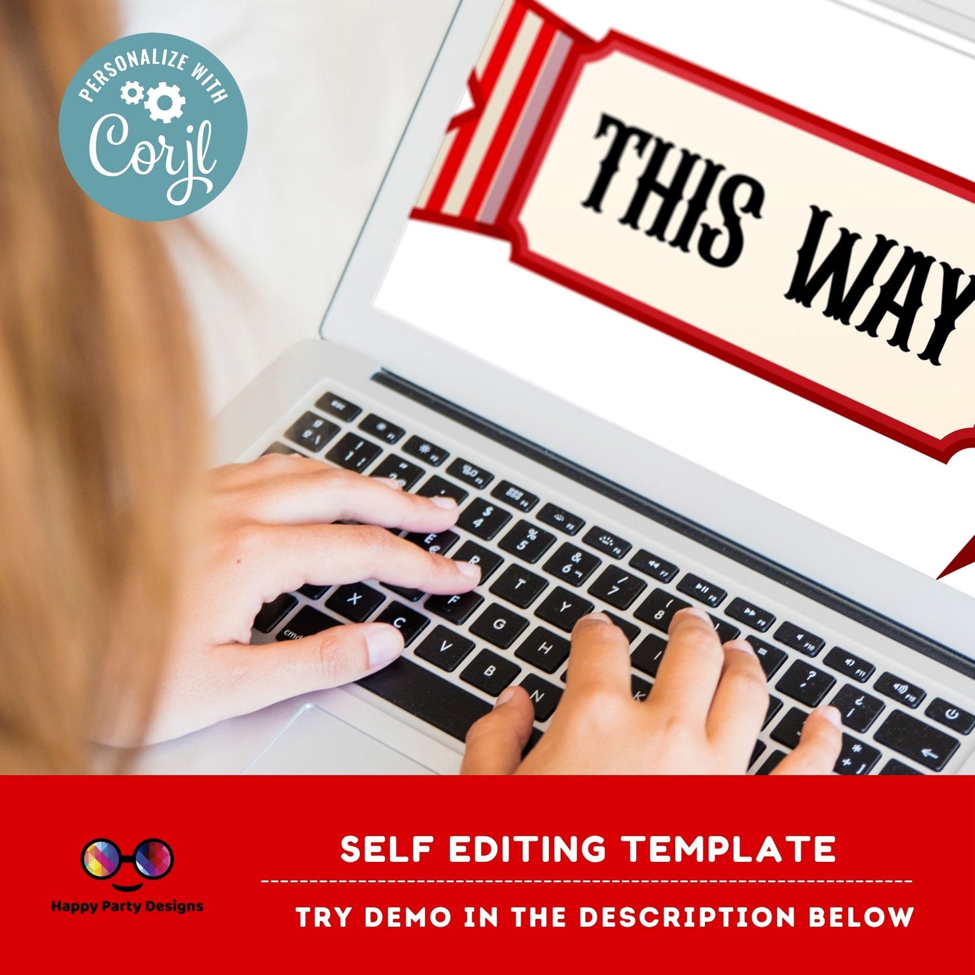 Carnival Circus Arrow Sign, Circus Birthday Direction Arrow Sign, Post | Editable Instant Download | Edit Online NOW Corjl | INSTANT ACCESS, circus party decor.
