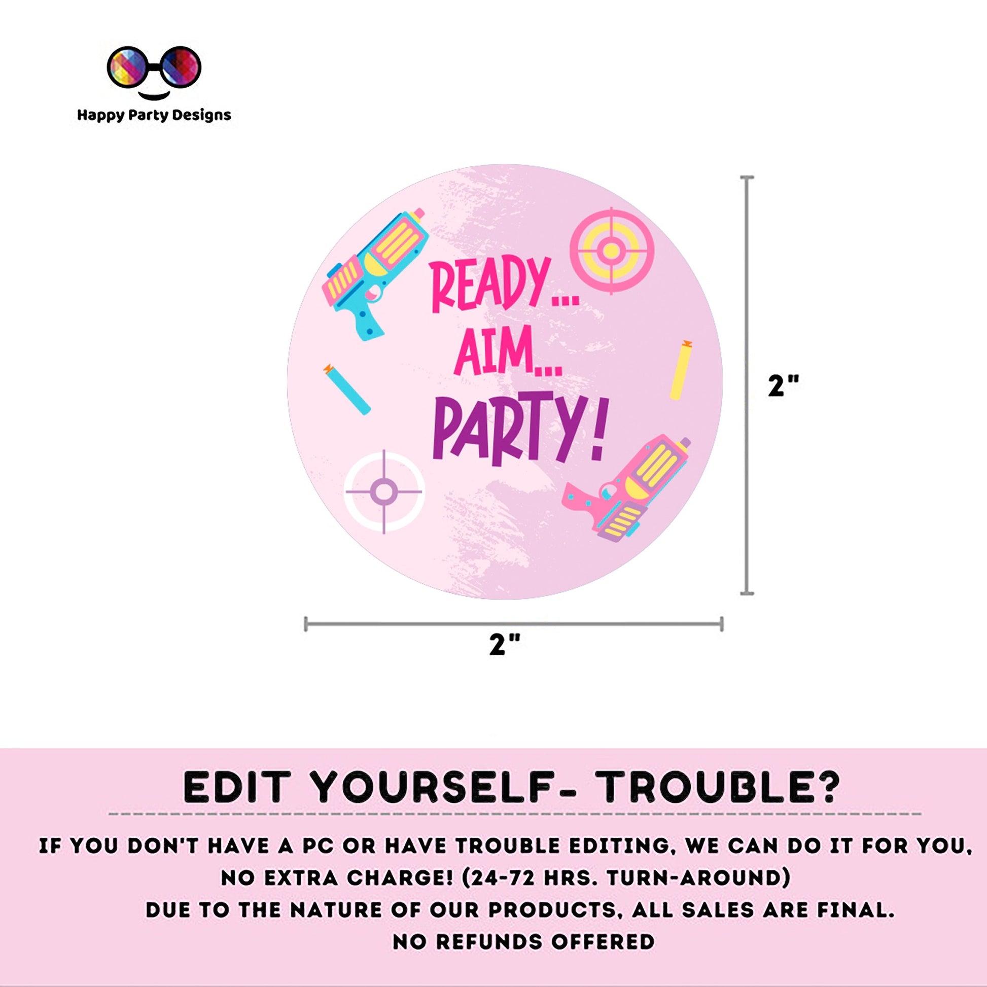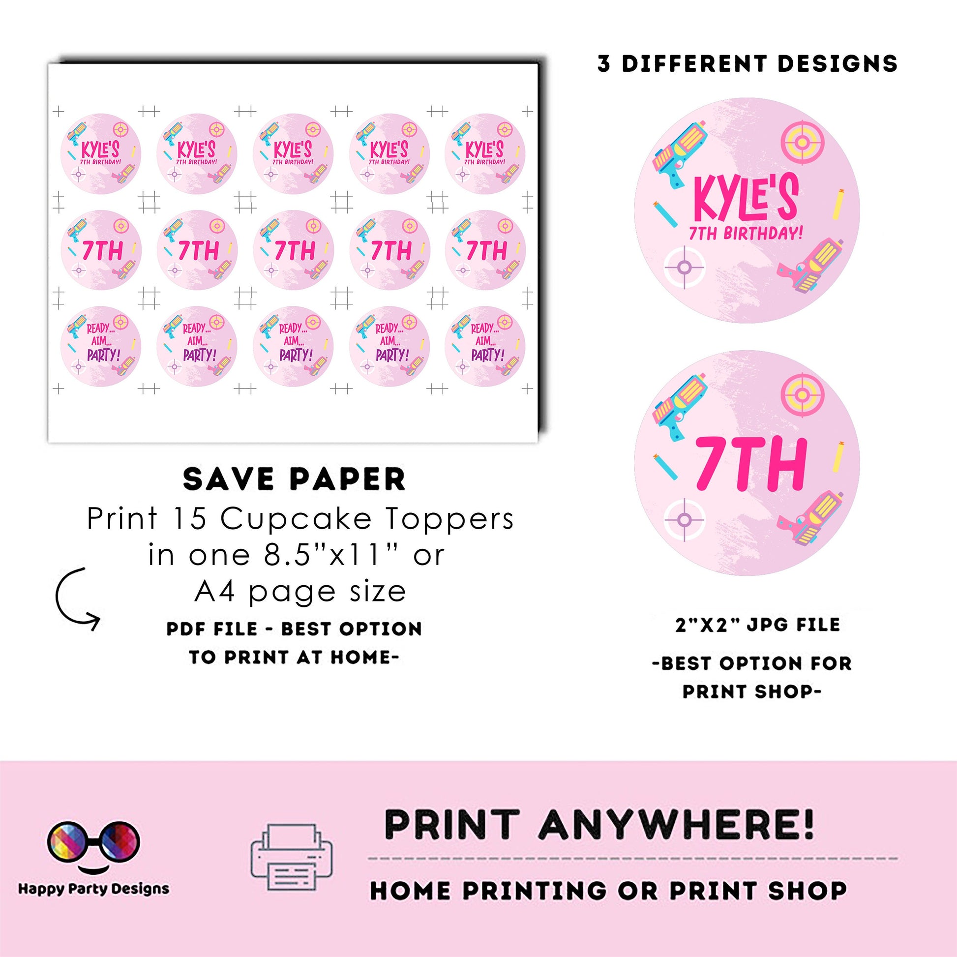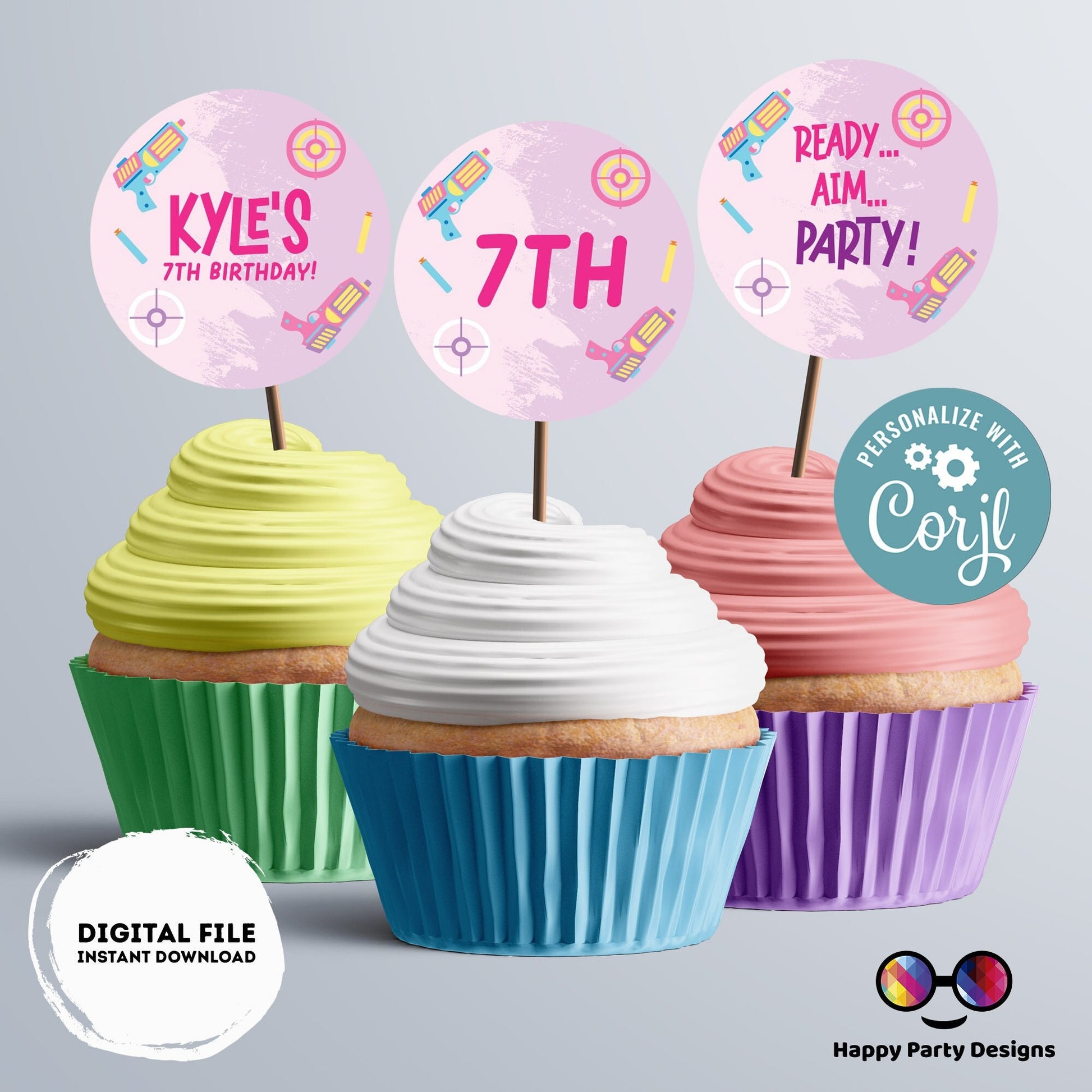 Editable Dart Gun Round Cupcake toppers | Gun Blaster Battle birthday Girl | Dart gun Birthday Party | Girl Birthday Party | stickers #K172