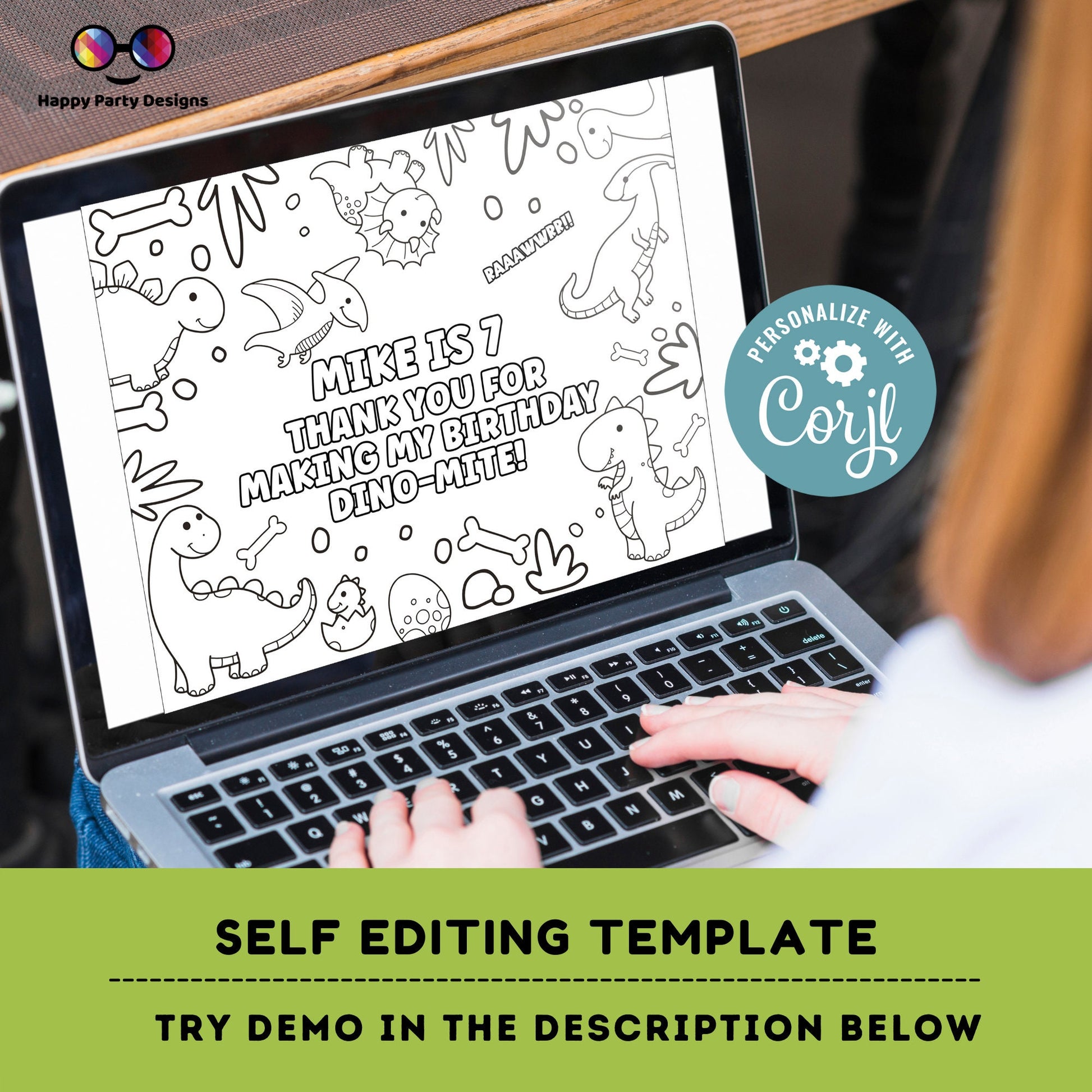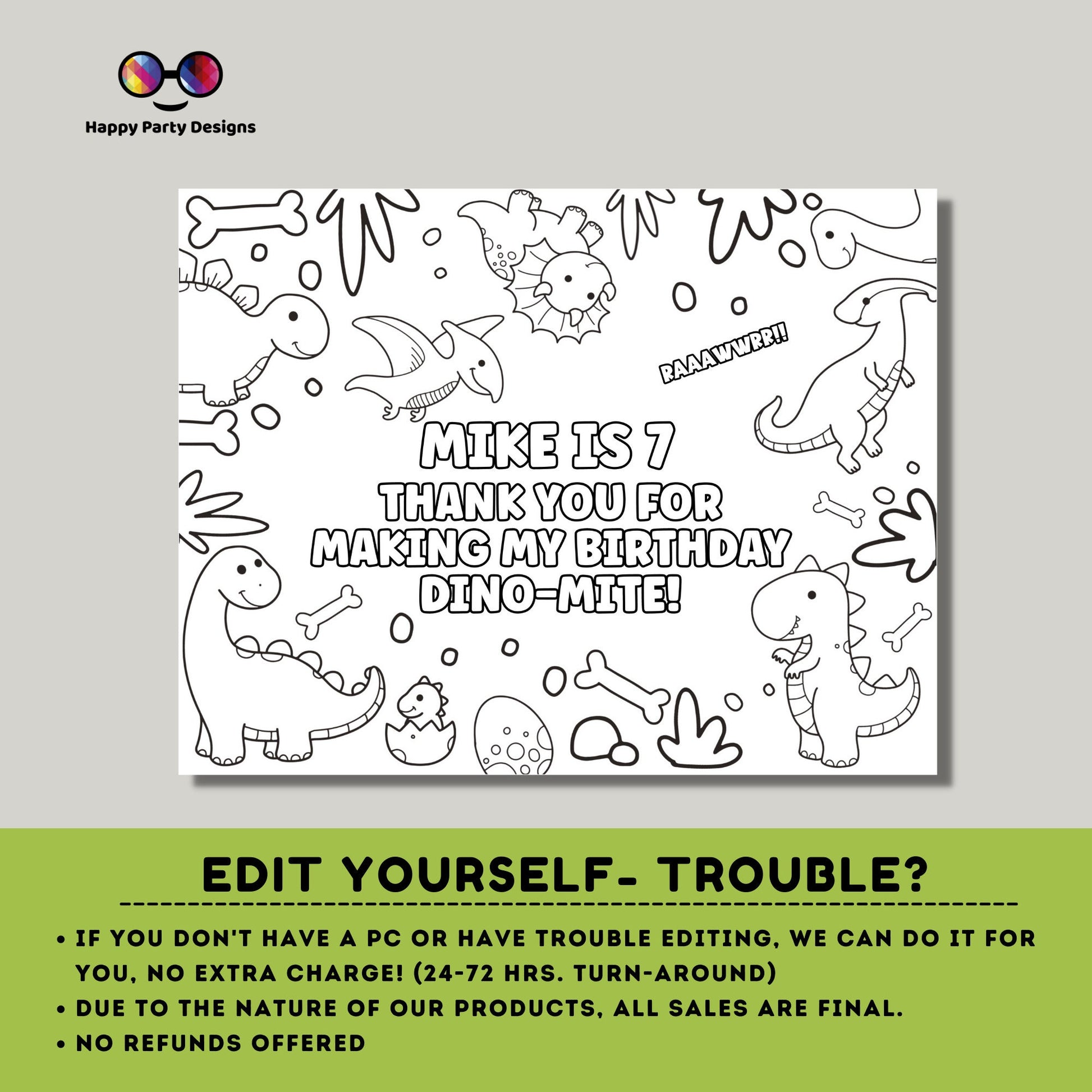 Editable Dino coloring page | Placemat coloring page | Any Age | Dinosaur birthday | Dinosaur Party Activity