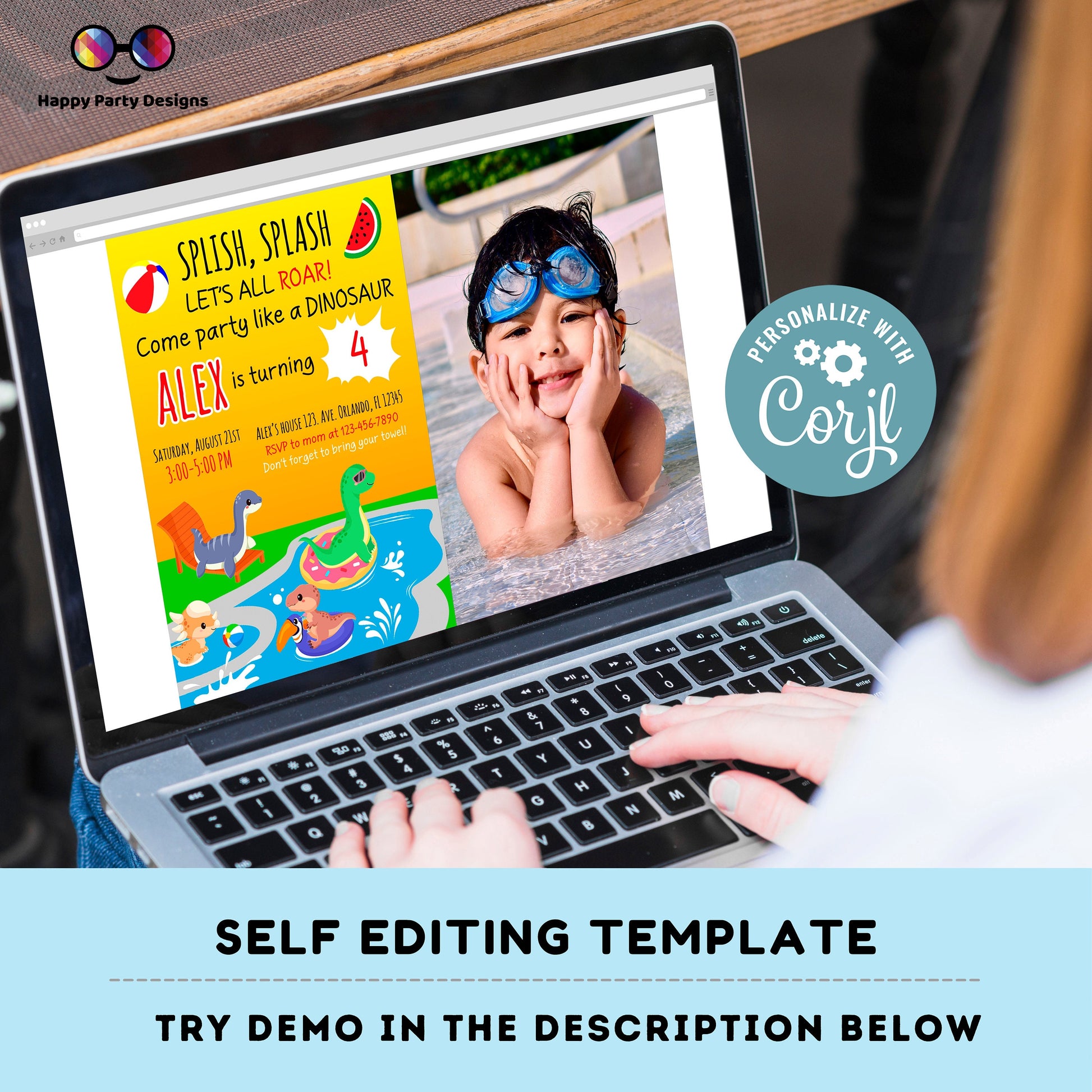 Editable Dinosaur Pool Party Invitation. Birthday. Editable template with Corjl.com