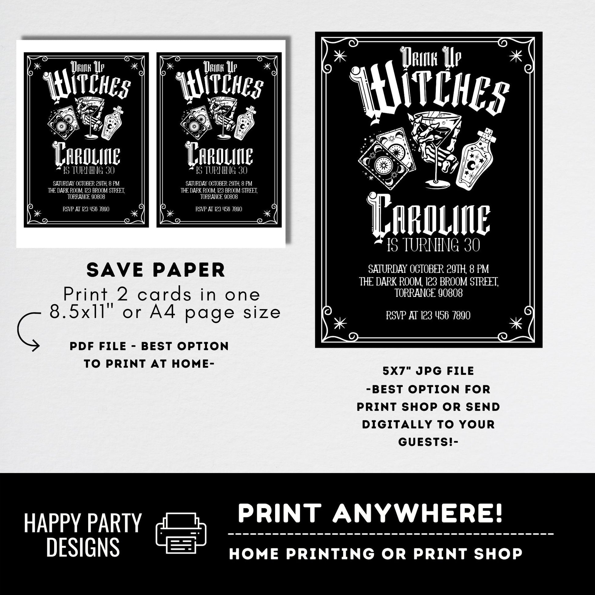 Halloween Party Drink Up Witches Invitation Template Printable Halloween Invite birthday Witch Cocktail party Digital Invitation Corjl. choose your poison. Celestial party. black and white. 30th birthday, any age!