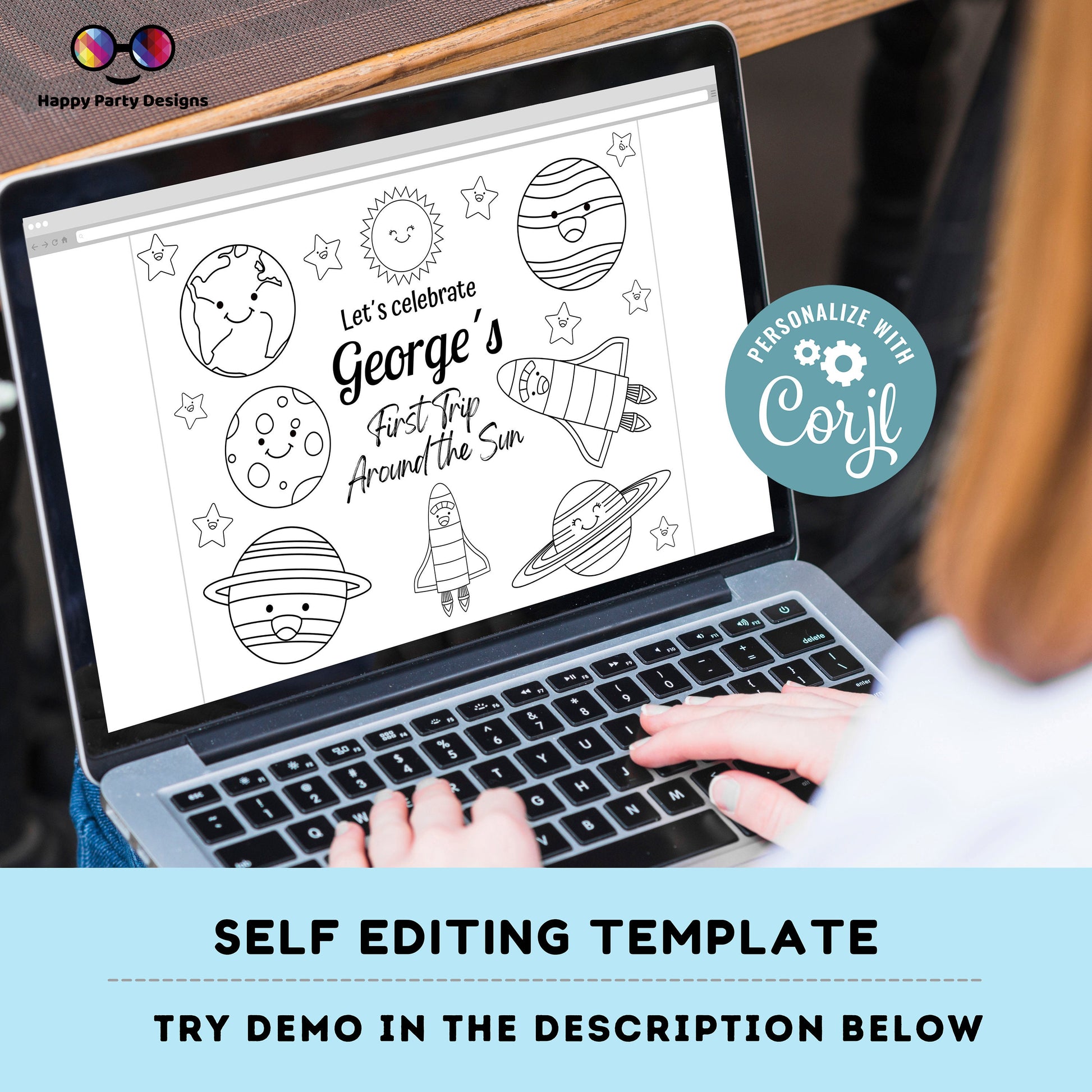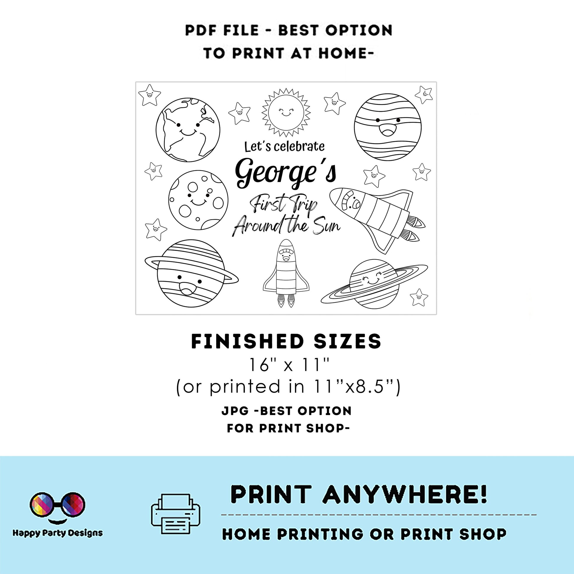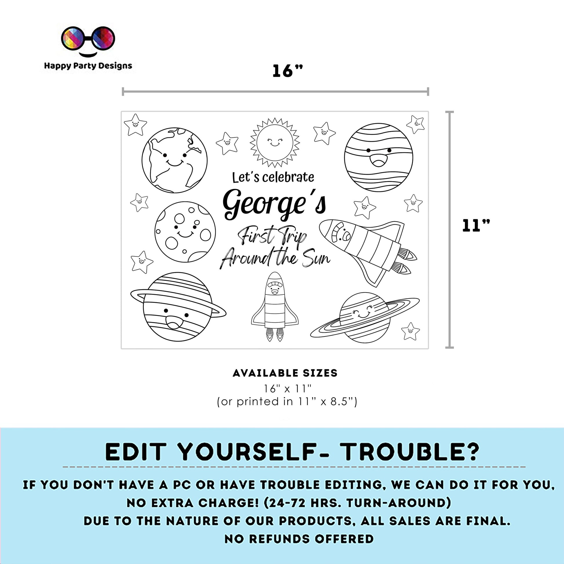 Editable first trip around the sun coloring page | Placemat coloring page | Any Age | planets | Outer Space party placemat #K5