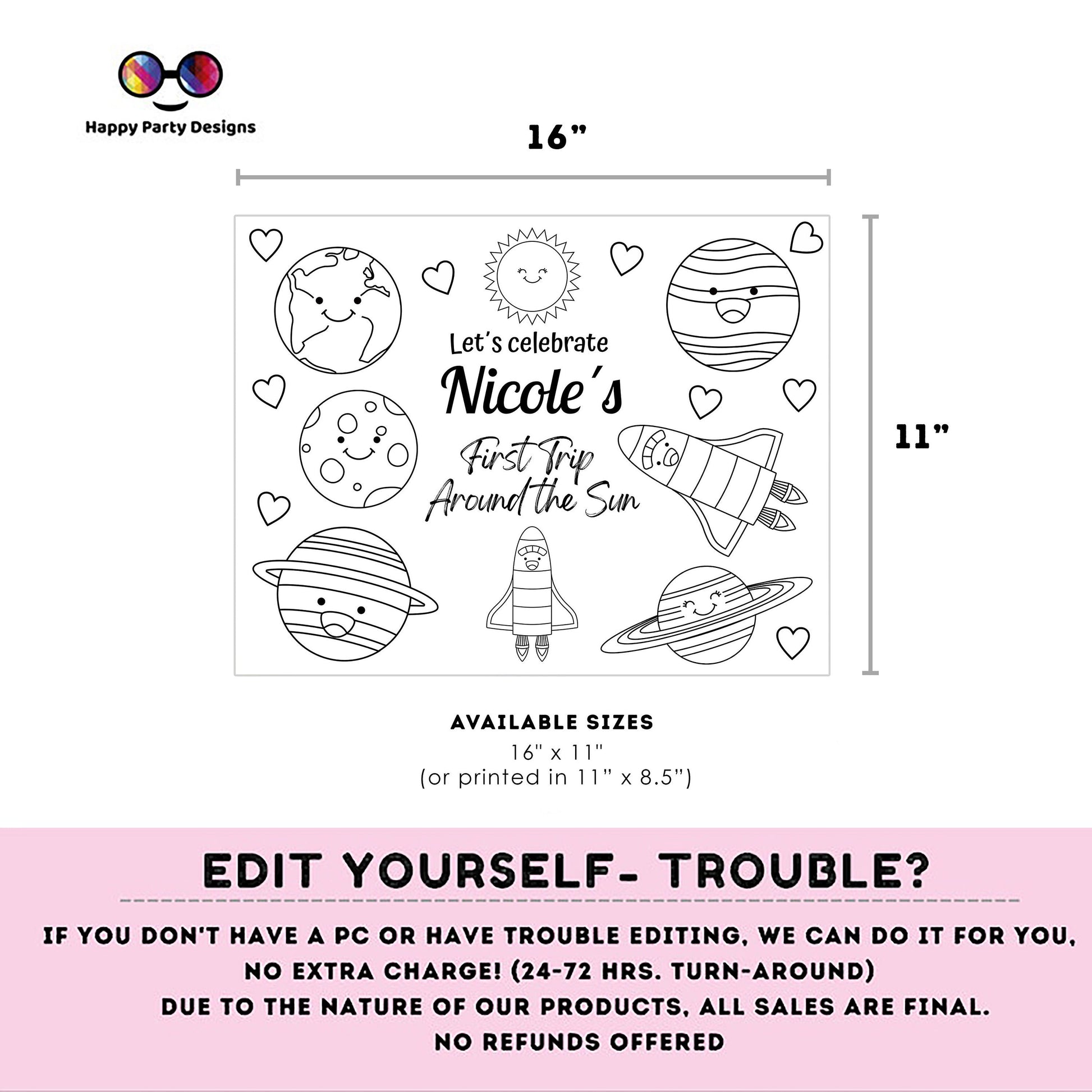 Editable first trip around the sun coloring page | Placemat coloring page | Any Age | planets | Outer Space party placemat #K57
