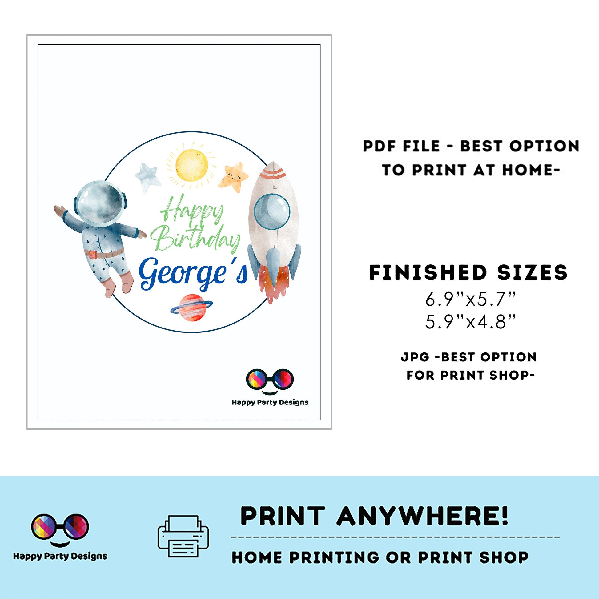 The products you purchase from Happy Party Designs are for PERSONAL USE ONLY and cannot be resold and/or distributed for any reason. You may not alter in any way images or other content in this shop without specific permission from Happy Party Designs copyrighted. Mass production, file sharing, selling and commercial use of the files is not permitted. All rights reserved.