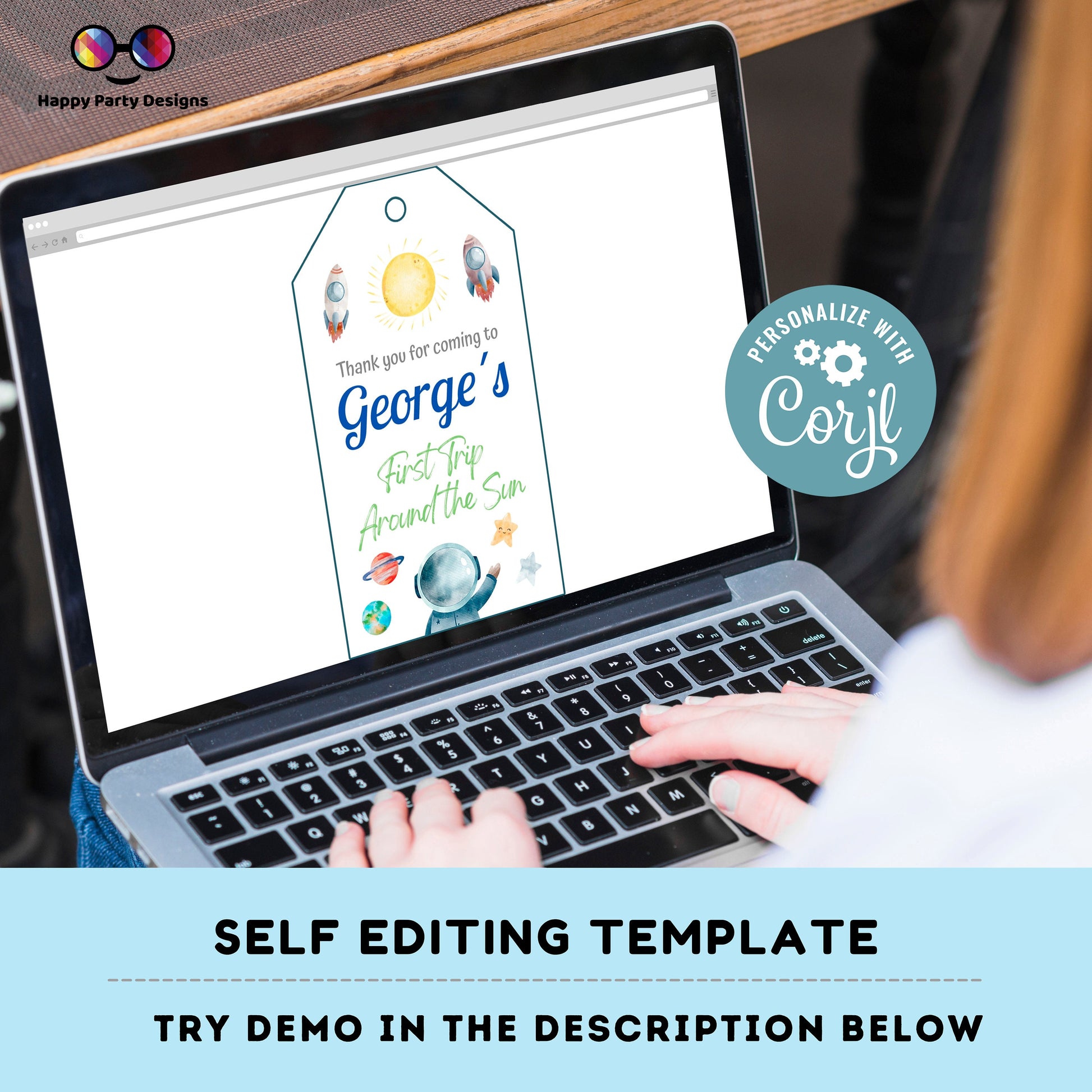 Editable First Trip Around the Sun Thank you tag | Editable Outer Space Party tag| Printable Template | Editable First Trip Around the Sun Party Favor tag | Outer Space editable favor tag | Digital Invitation | Instant download stickers
