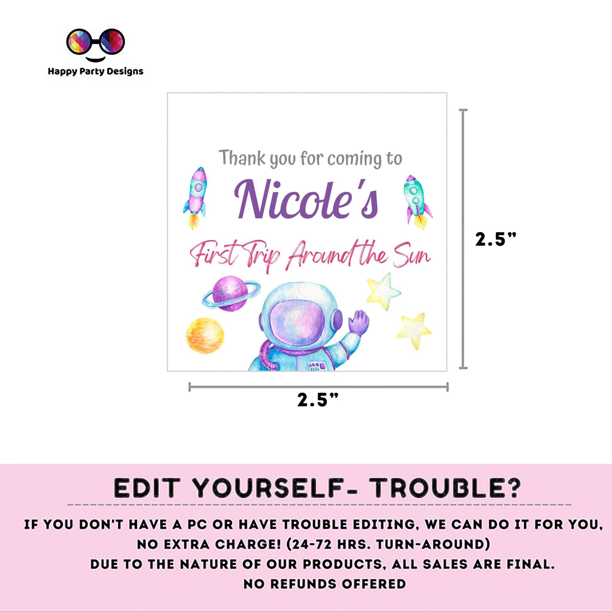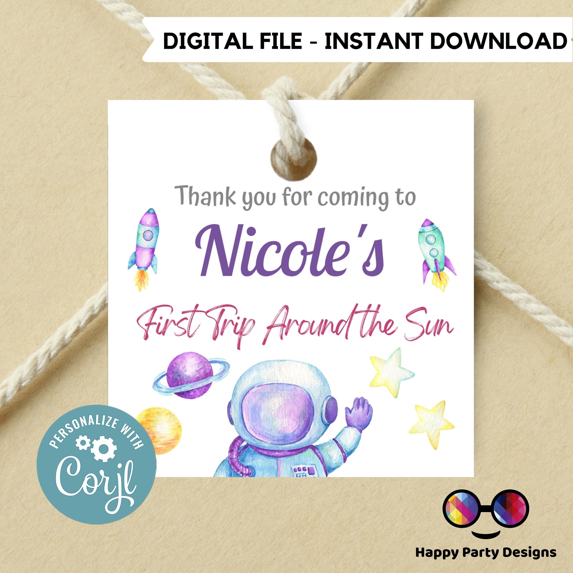 Editable First Trip Around the Sun Thank you tag | Editable Outer Space Party tag| Printable Template | Editable First Trip Around the Sun Party Favor tag | Outer Space editable favor tag | Digital Invitation | Instant download stickers