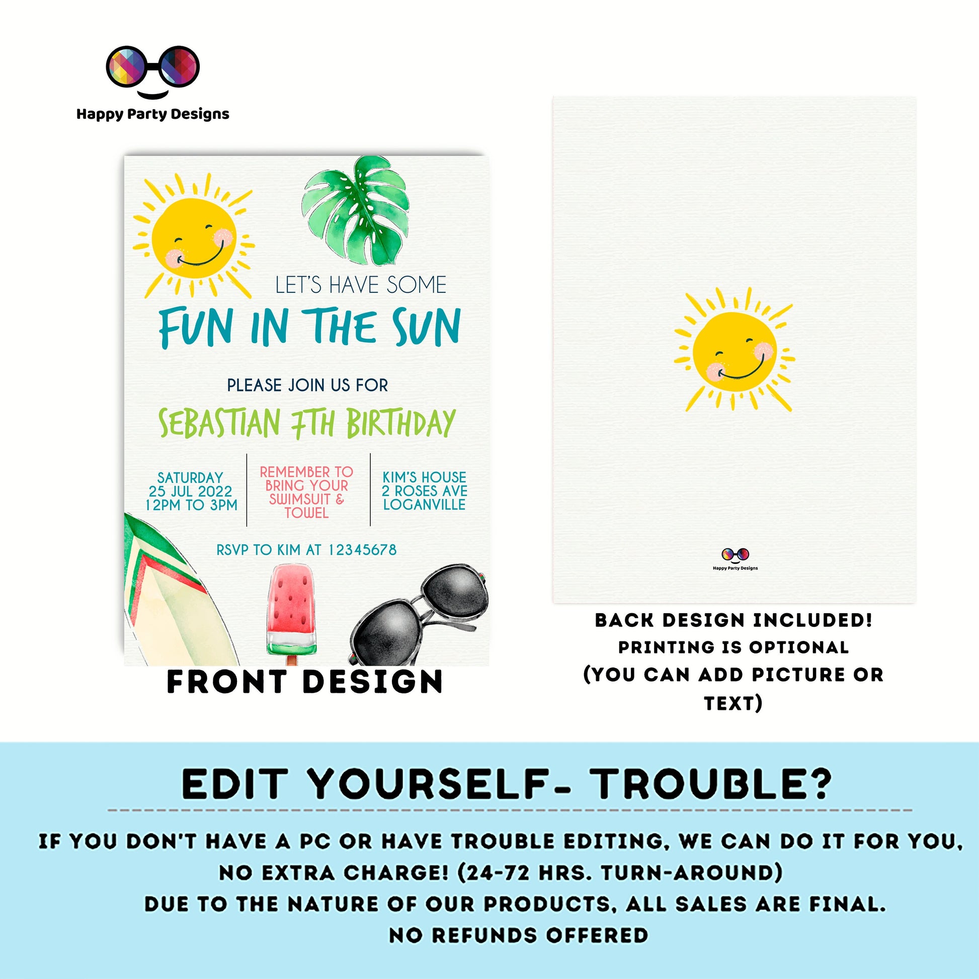 editable fun in the sun birthday invitation template | Pool Party Invitation | Summer | Any Event! | Beach or Pool | Fun in the Sun #K118
