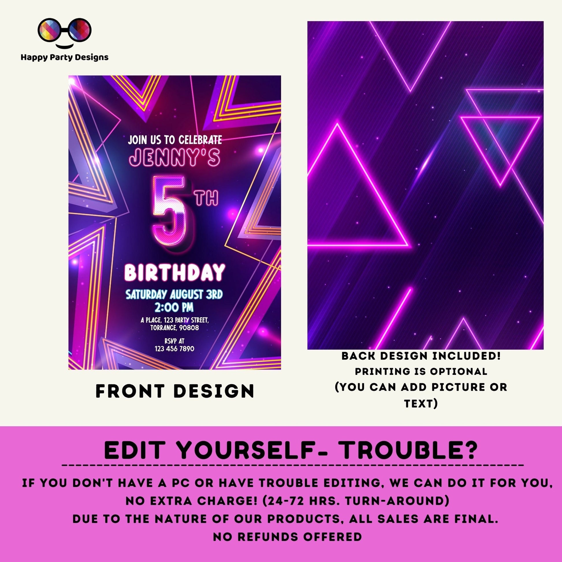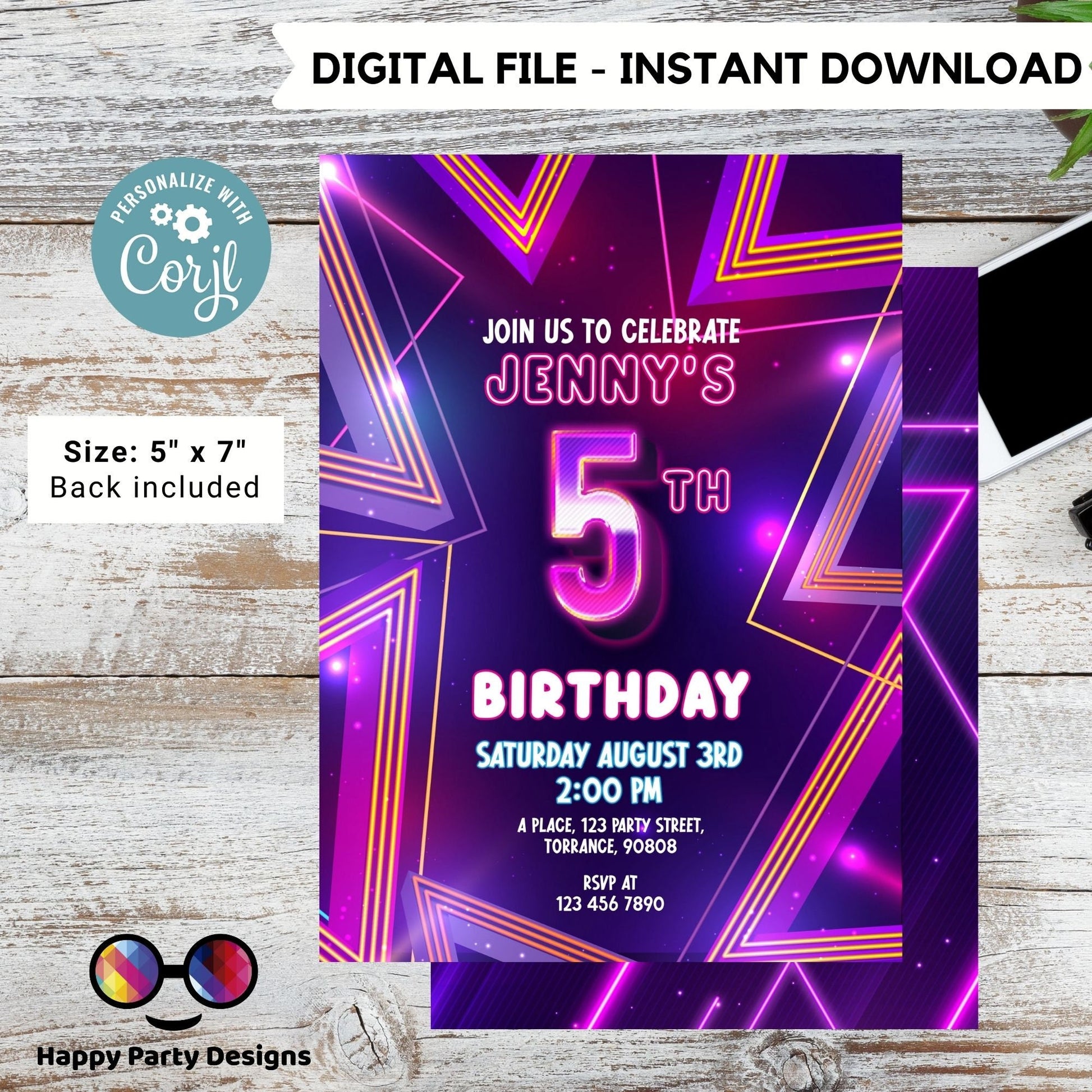 EDITABLE girl 5th birthday invitation | Neon Glow in the dark Party | Birthday girl | 5th pink and purple Birthday #K186