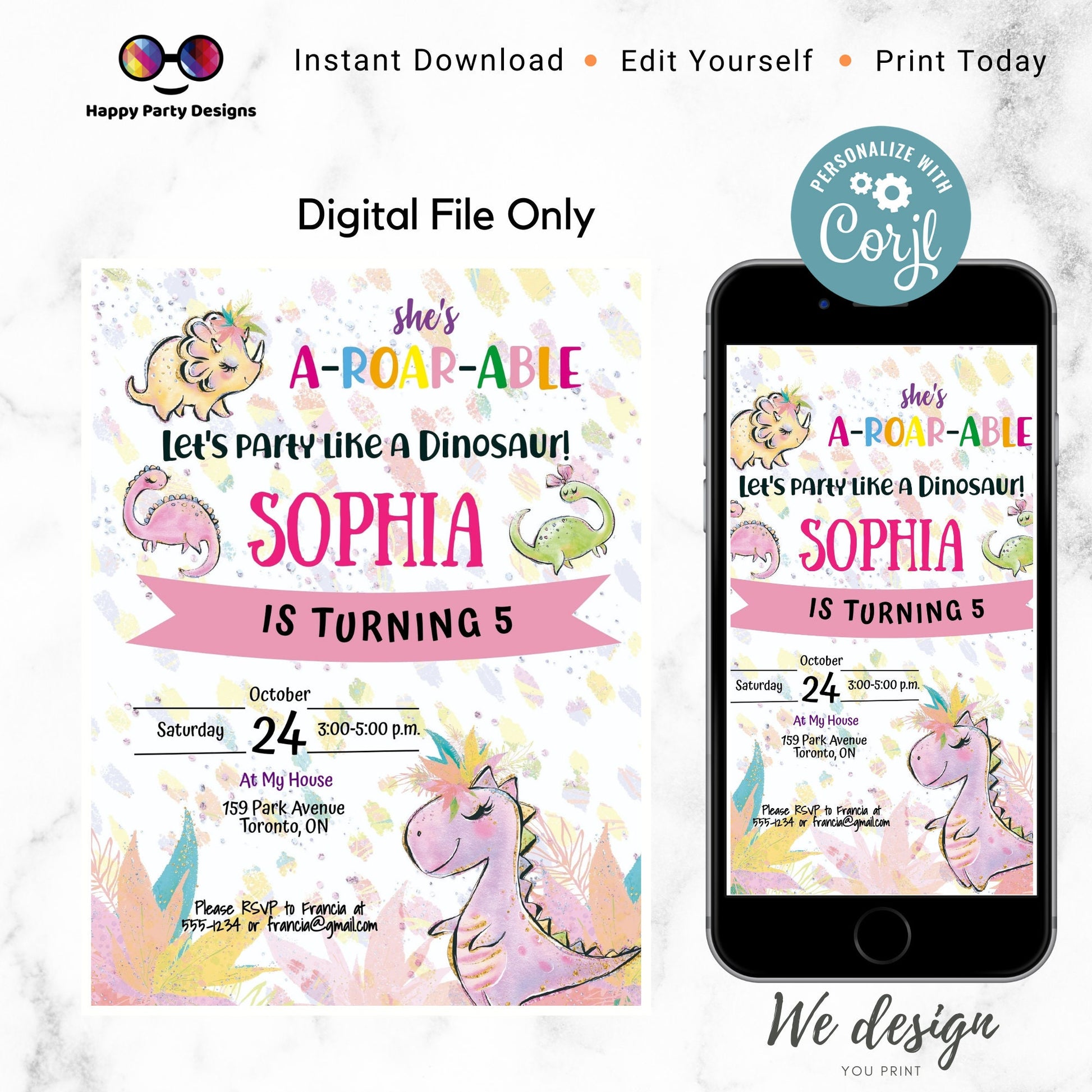 DINOSAUR GIRL BIRTHDAY INVITATION. EDITABLE TEMPLATE WITH CORJL.COM