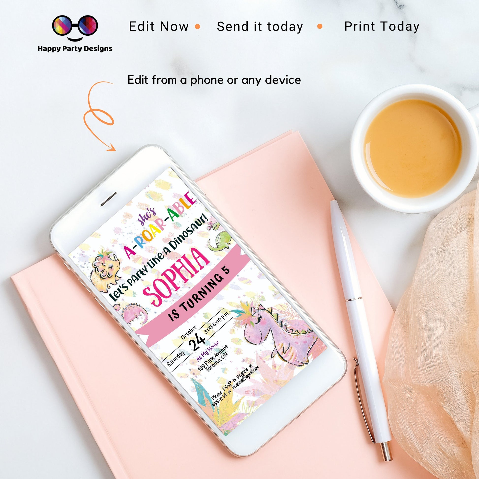 Editable Girl Dinosaur Birthday Invitation | A-Roar-able Birthday Invitation | Dino Birthday invitations | Pink Dinosaur Birthday Invitation