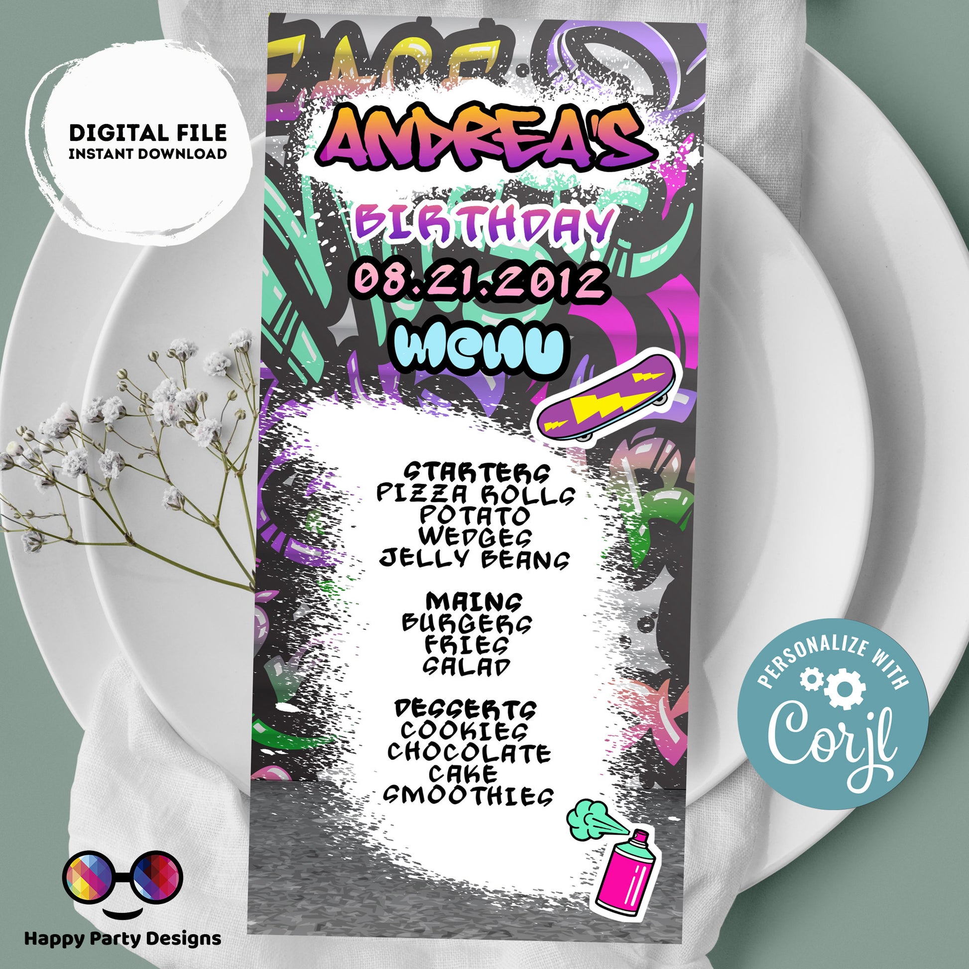 Editable Graffiti Menu | Digital graffiti printable menu | Birthday girl | Graffiti menu | Personalize Online #K2