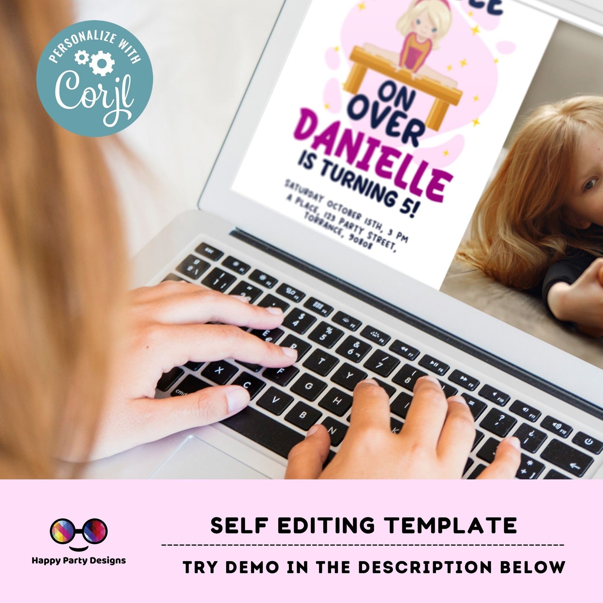 Editable Gymnastics Birthday Invitation with photo | Sports Invitation | Girl Tumbling Gymnasts Birthday Invite | tumble on over Party #K232