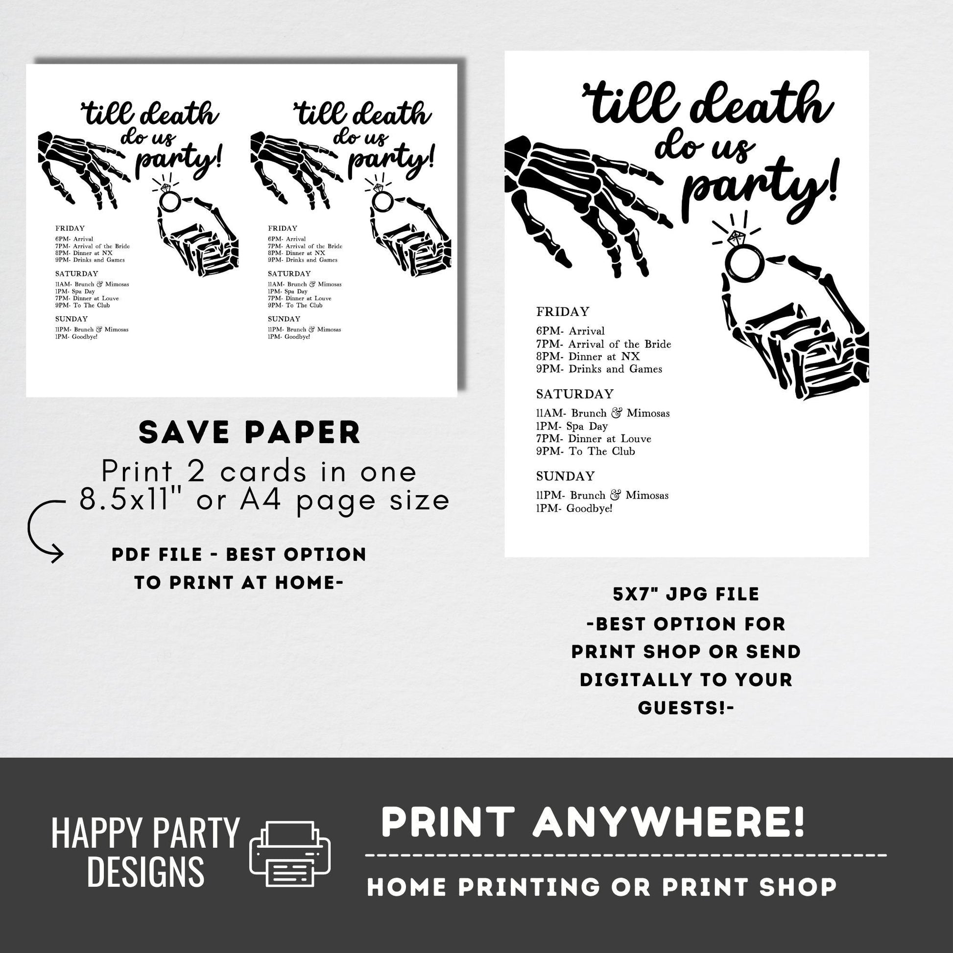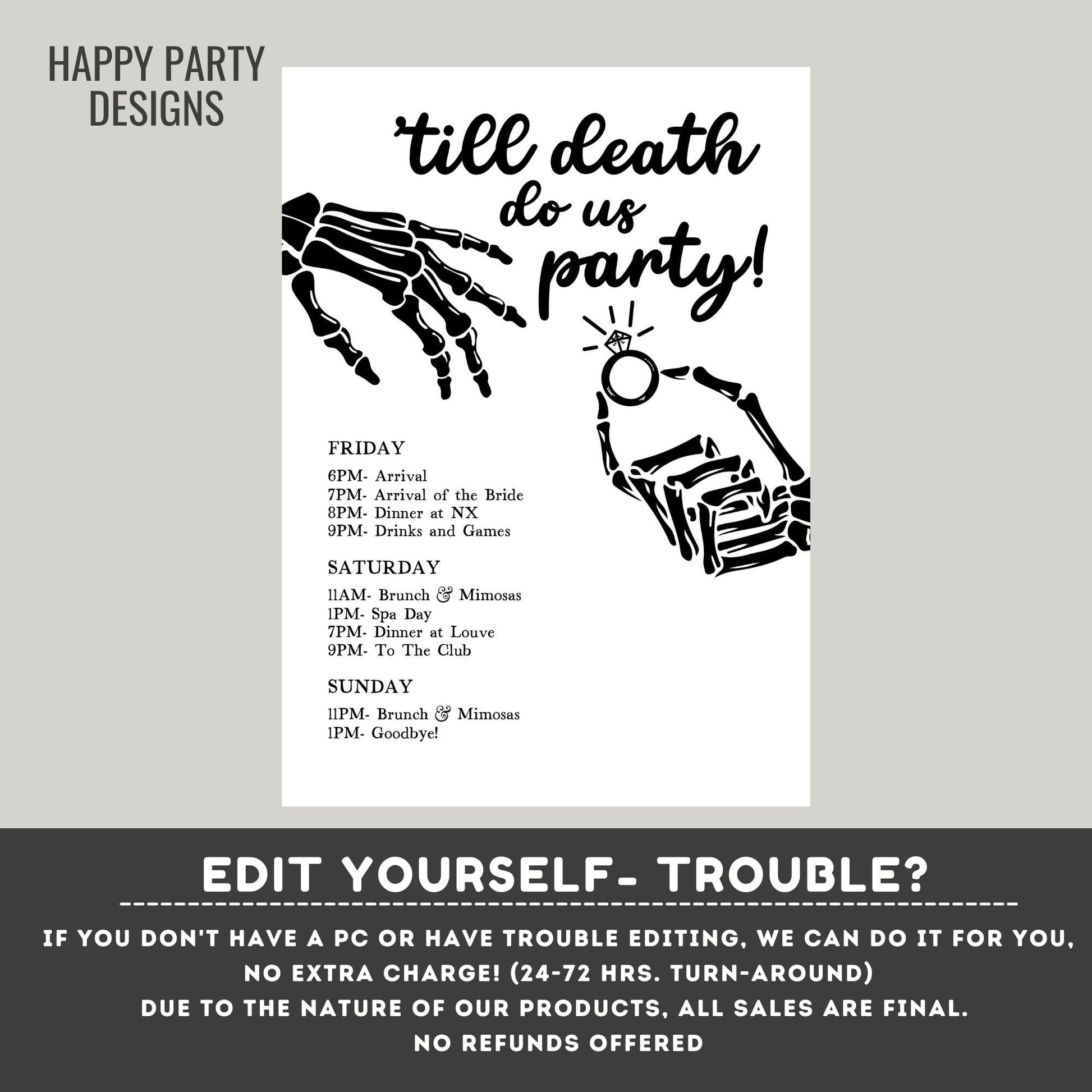 'Til death do us Party schedule, BRIDE or DIE Fall Bachelorette Itinerary Template Digital Download Editable Personalize itinerary Girls Bach Weekend Travel Autumn. Bride or Die Bachelorette Invitation, Gothic Bachelorette Party Invite, Editable Invitation Template, Bachelorette Weekend, Witchy.