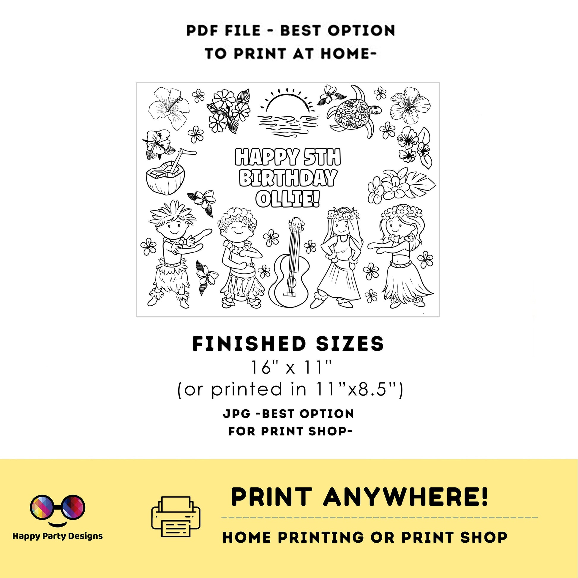 Editable Hawaiian party coloring page | Aloha placemat | Any Age | Beach birthday | Luau Party Coloring Pages | beach party kids