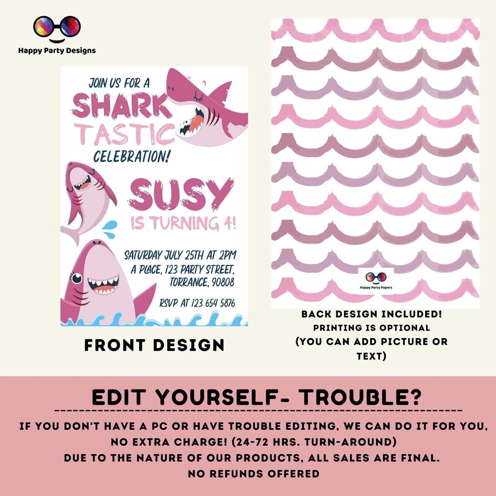 The products you purchase from Happy Party Designs are for PERSONAL USE ONLY and cannot be resold and/or distributed for any reason. You may not alter in any way images or other content in this shop without specific permission from Happy Party Designs copyrighted. Mass production, file sharing, selling and commercial use of the files is not permitted. All rights reserved.