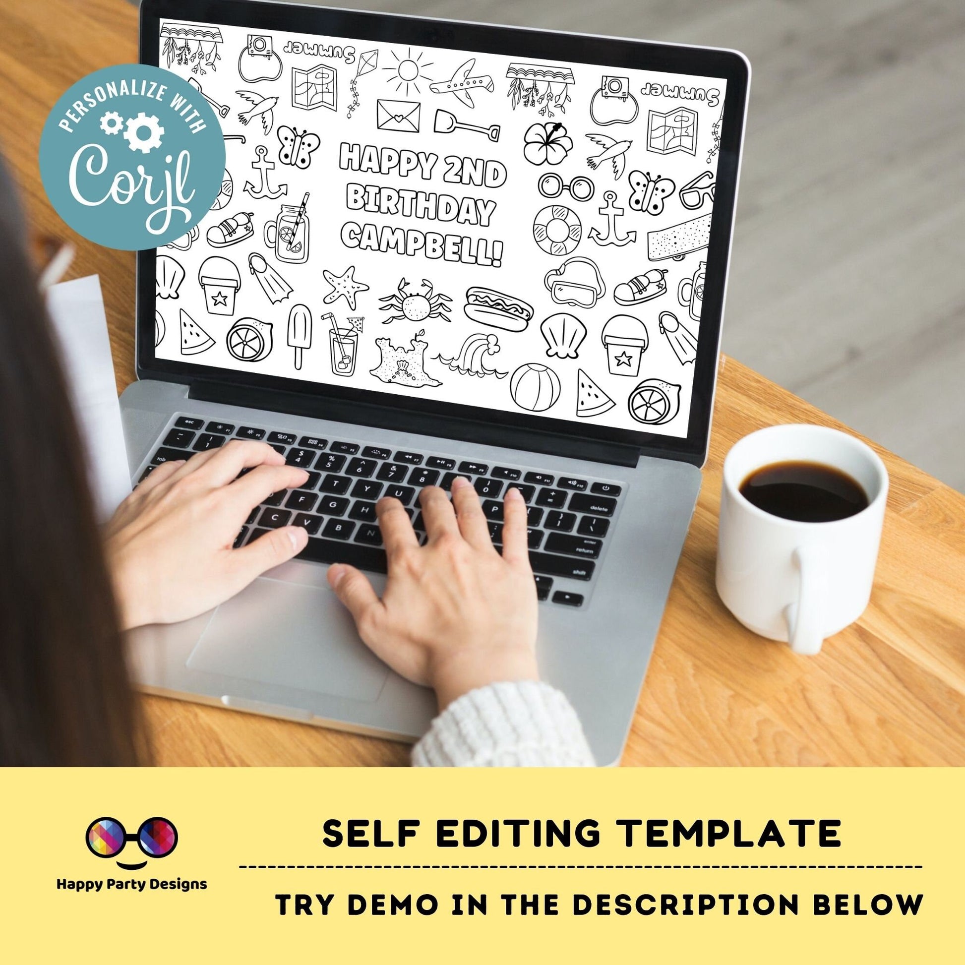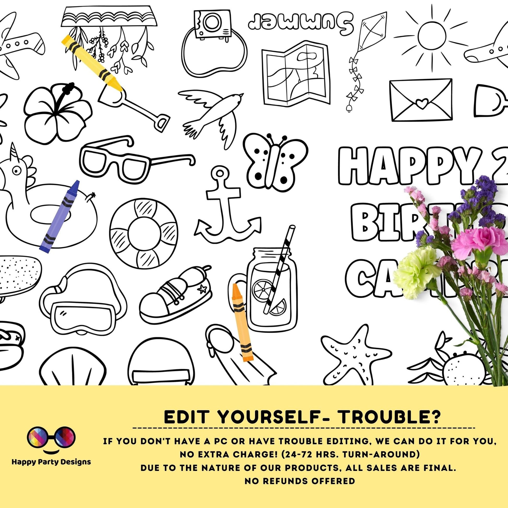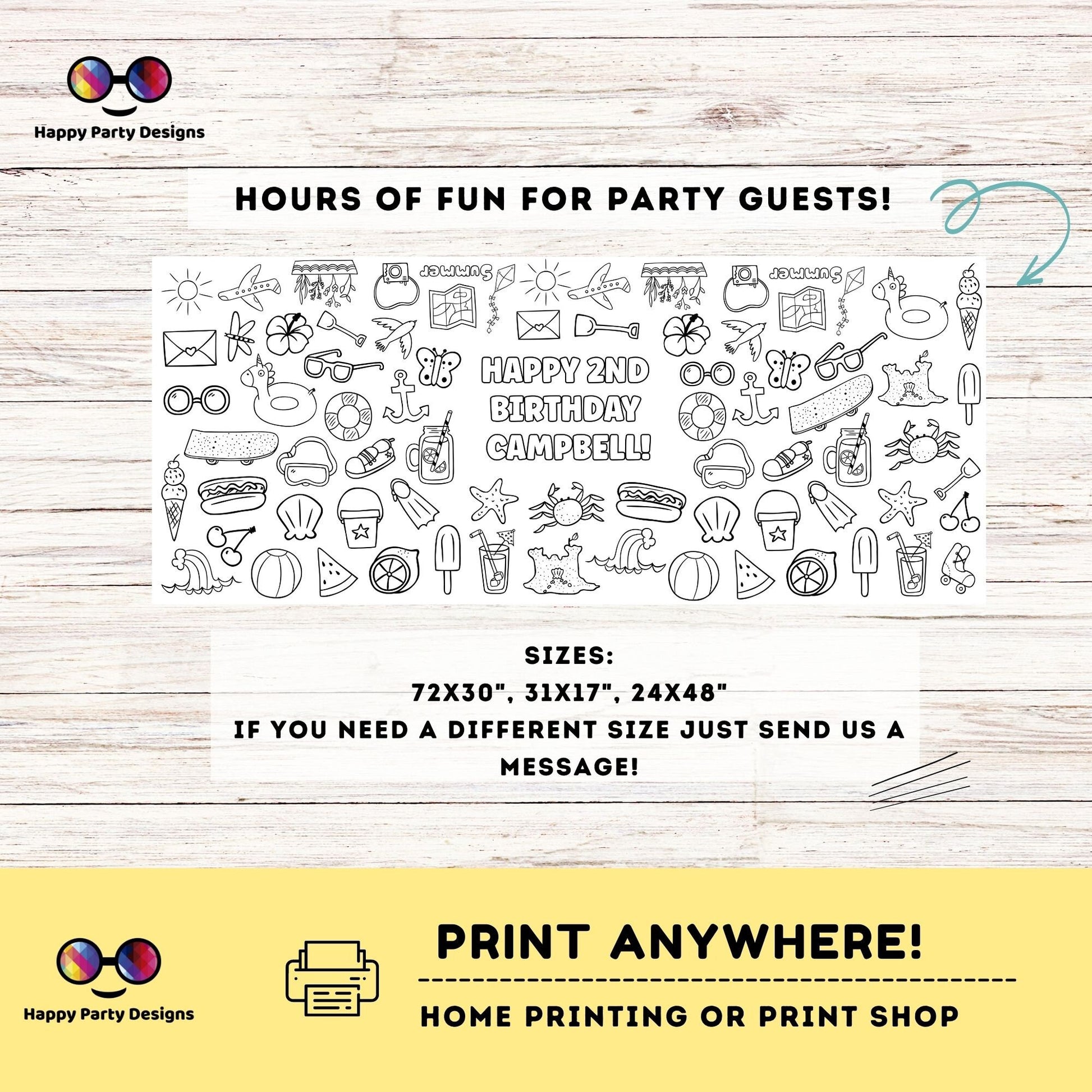 Summer XL coloring table runner | Editable summer coloring page | Placemat coloring page | summer party | Pool summer Party Activity | #K97